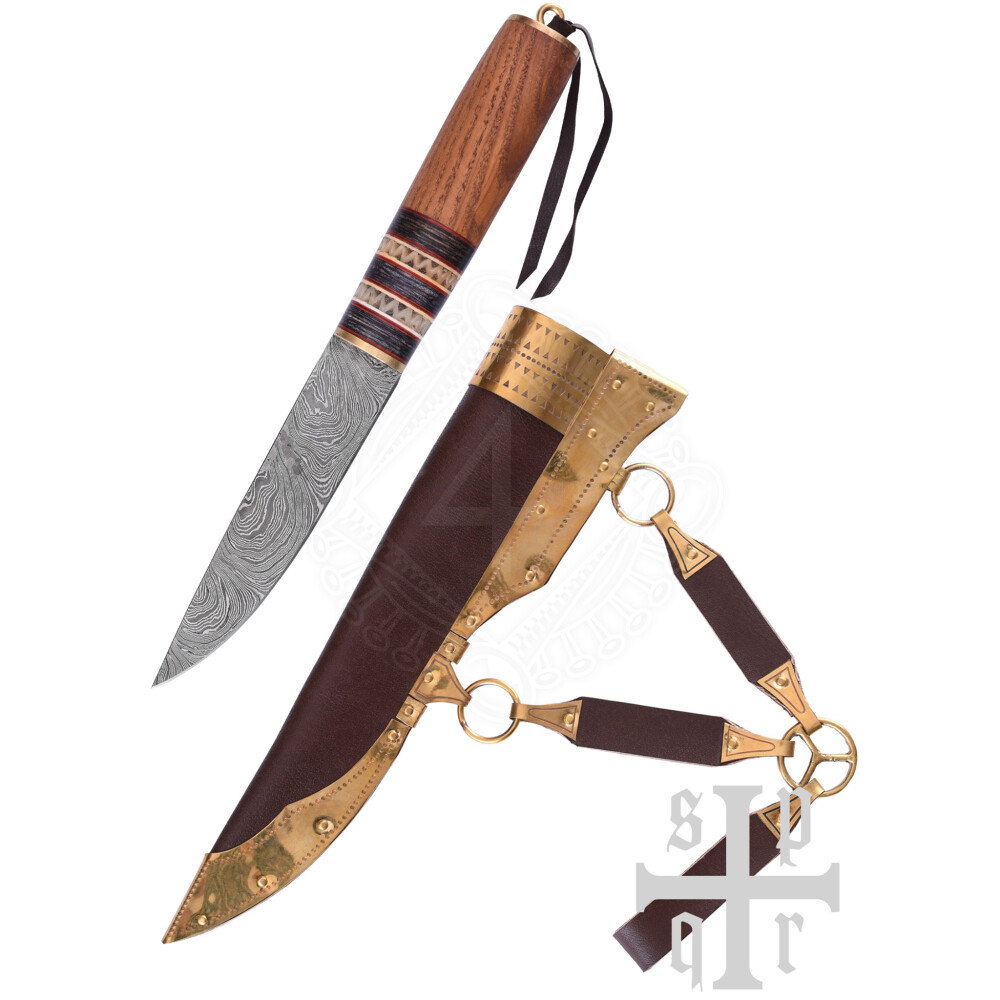 Dieses handgefertigte wikingerzeitliche Messer (Sax) besitzt eine scharfe Klinge aus 256-Lagen-Damaststahl*. Das Vorderteil des Holzgriffes mit sich abwechselnden, durch rote Spacer getrennten Schichten aus dunklem Holz und hellem Knochen ist ein wahrer Hingucker. Griff-Endkappe und -Zwinge sind aus Messing gefertigt. Zum Lieferumfang gehört eine wunderschöne Scheide aus gegerbtem Leder mit reich verzierten Messingbeschlägen. Das Tragesystem besteht aus zwei Trageringen, einem Riemenverteiler und drei Lederriemen. In der Wikingerzeit waren Tragesysteme dieser Art weit verbreitet. Der Riemenverteiler diente dazu, die einzelnen Riemen so zu verteilen, dass das Schwert, bzw. das Saxmesser für ein schnelles Herausziehen aus der Scheide in einem optimalen Winkel am Gürtel getragen werden konnte. Weitere Produktinformationen ...