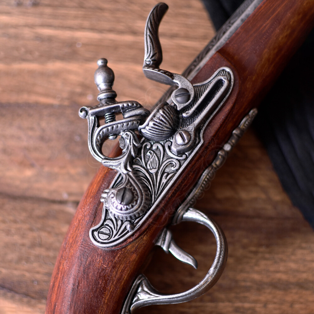 Die Mechanik dieser Steinschlosspistole ist voll beweglich, jedoch ist die Waffe nicht schussfähig, sondern ein reiner Dekorationsartikel.