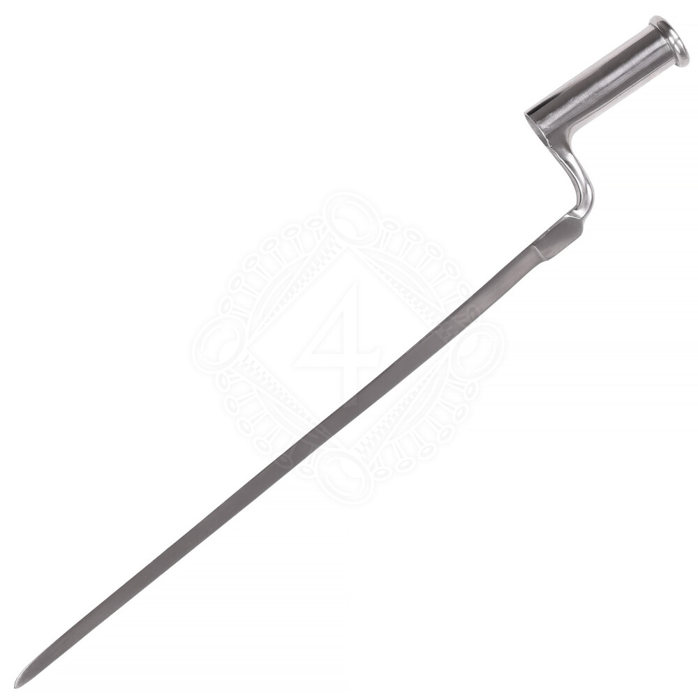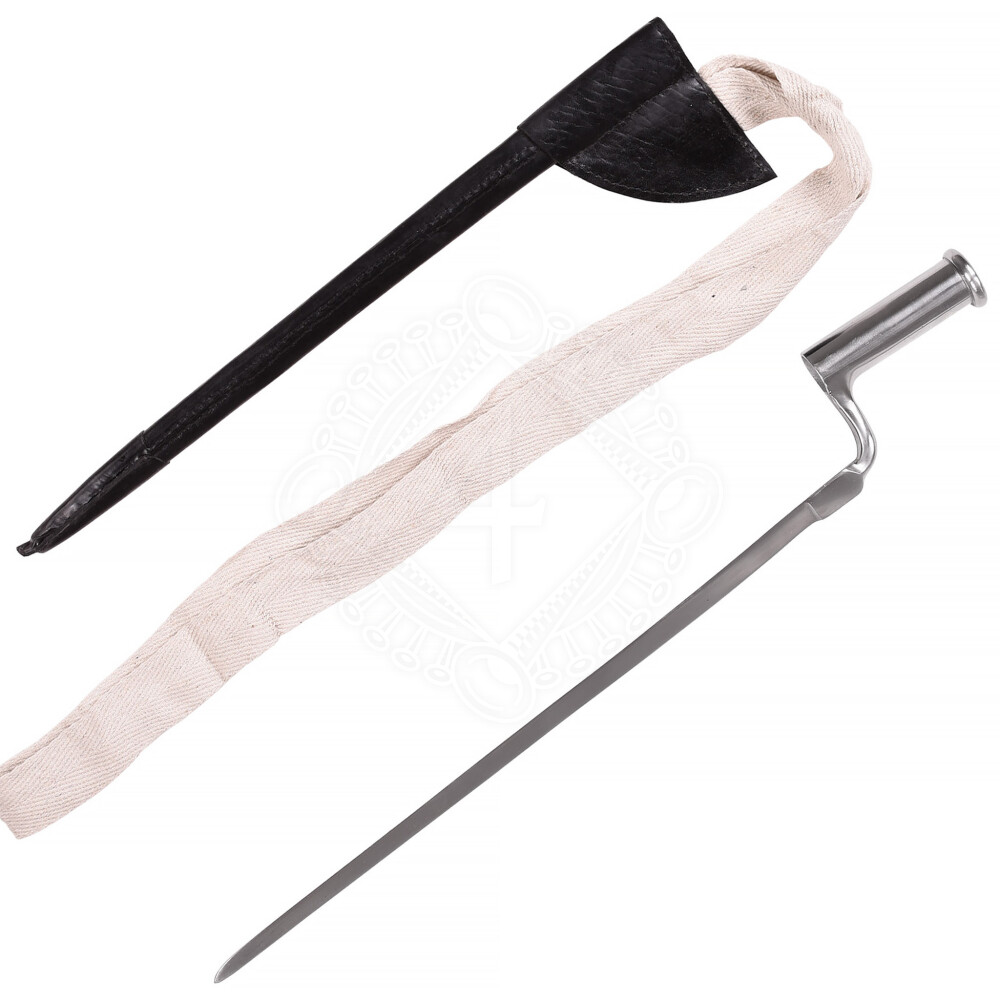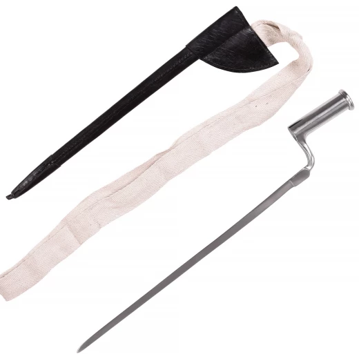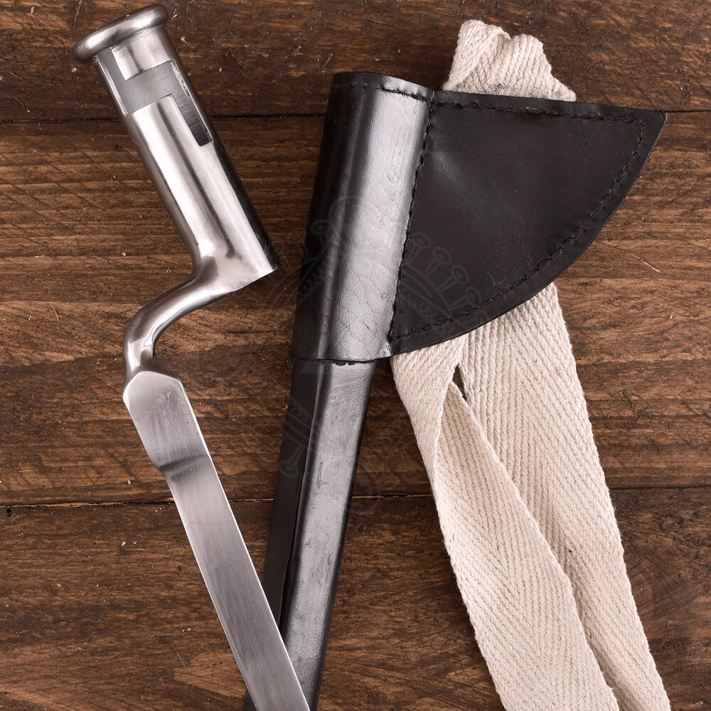 Diese authentische Nachbildung des Brown Bess-Bajonettes besteht aus Stahl. Die im Lieferumfang enthaltene Scheide ist aus Leder gefertigt und besitzt ein Trageband aus Stoff.