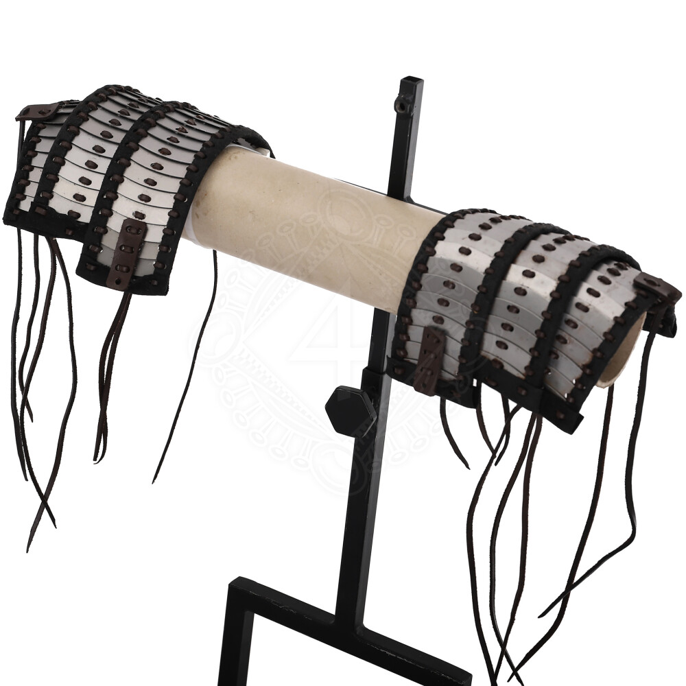 Jede Schulter ist sorgfältig aus einzelnen Stahllamellen von ca. 1 mm Stärke (entspricht 20 Gauge) zusammengesetzt, die fest mit widerstandsfähigen Riemen verbunden sind. Die Gesamtdicke inklusive Ledereinfassung beträgt ca. 6 mm. Dadurch sind die Schultern robust, behalten aber eine überraschende Flexibilität, die für den aktiven Kampf wichtig ist. Sie sind rundum mit festem Wildleder eingefasst, was nicht nur den Tragekomfort erhöht (insbesondere an den Kanten, die den Körper oder die Kleidung berühren), sondern auch die darunterliegende Kleidung schützt und den Schultern ein vollendetes, ästhetisch ansprechendes Aussehen verleiht. Die genauen Maße (Länge ca. 31 cm, Breite ca. 13 cm) und das Gewicht des Paares (752 g) garantieren eine gute Abdeckung bei gleichzeitig angemessenem Gewicht. Ein System aus Lederschnüren ermöglicht das sichere Anbinden an entsprechende Halterungen (Laschen) an der Rumpf-Lamellenrüstung im Achselbereich und gegebenenfalls auch am Arm zur besseren Fixierung.