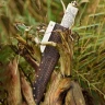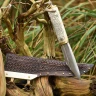 Dieses kleine Gebrauchsmesser der Wikingerzeit, welches aufgrund seiner besonderen Klingenform auch broken back Sax genannt wird, besitzt eine kurze, handgeschmiedete Klinge aus Kohlenstoffstahl mit kräftigem Rücken. Der polierte, eindrucksvolle Knochengriff ist beidseitig mit schönen nordischen Gravuren im Borrestil (ca. 850-950 AD) verziert und schließt zur Klinge hin mit einer Zwinge aus Messing ab. Am anderen Ende verfügt die ebenfalls aus Messing gefertigte Griffkappe über eine praktische Öse aus Stahl mit Messingring zur Aufnahme eines Tragebands oder zum bequemen Herausziehen des Messers aus der Scheide (Band nicht inbegriffen).