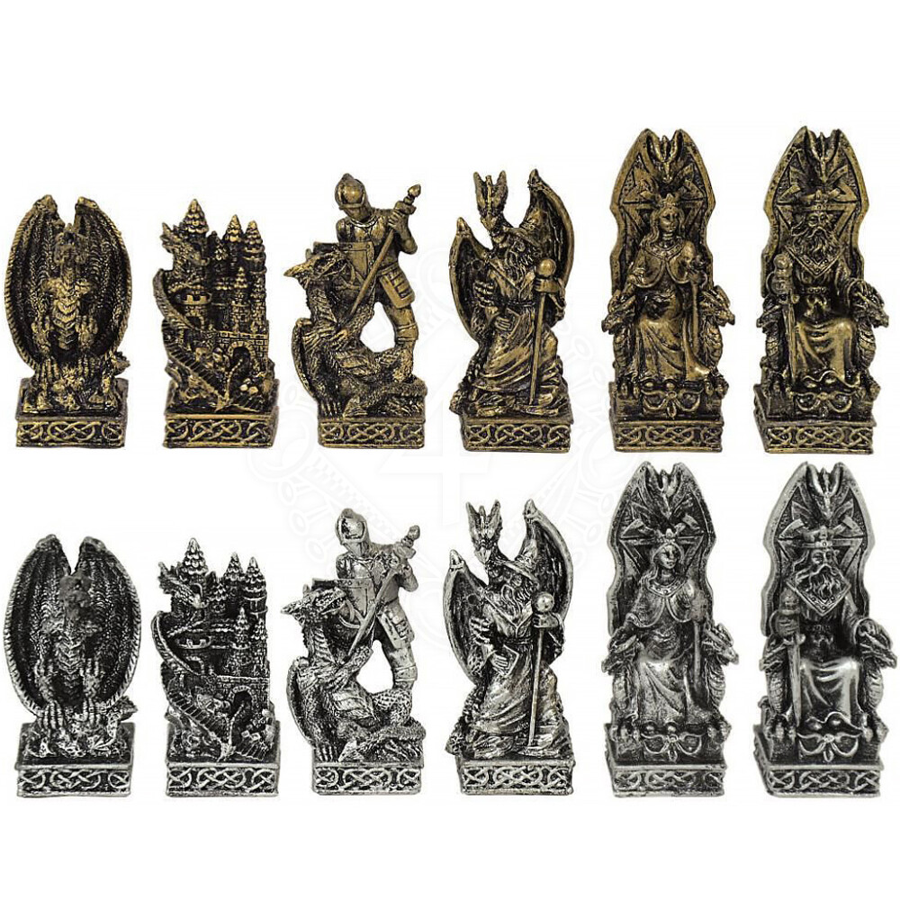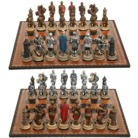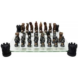 Schachfiguren König Arthur, goldene und silberne Figuren mit Schachbrett aus Glass