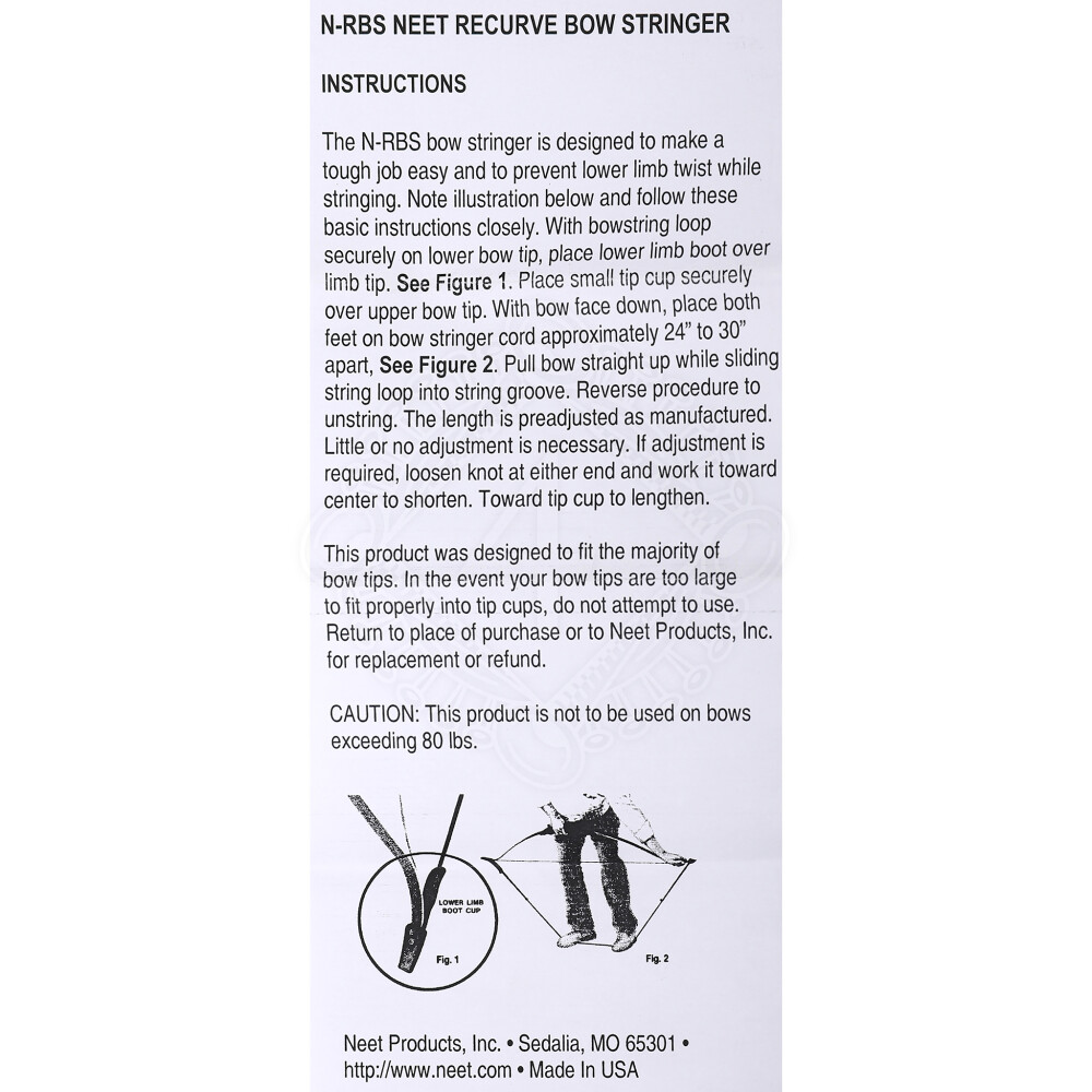 Damit dir diese Spannschnur lange dienste leistet, setze sie keiner unnötigen Nässe aus. Sollte das Wildleder nass werden, lasse es bei Zimmertemperatur langsam trocknen (niemals auf der Heizung, da das Leder sonst hart und brüchig wird). Kontrolliere die Nylonschnur regelmäßig auf Abnutzung. Achtung: Der Hersteller warnt ausdrücklich vor der Verwendung bei Bögen mit einem Zuggewicht von über 80 Pfund (36 kg). Bei stärkeren Bögen besteht die Gefahr, dass die Schnur reißt.