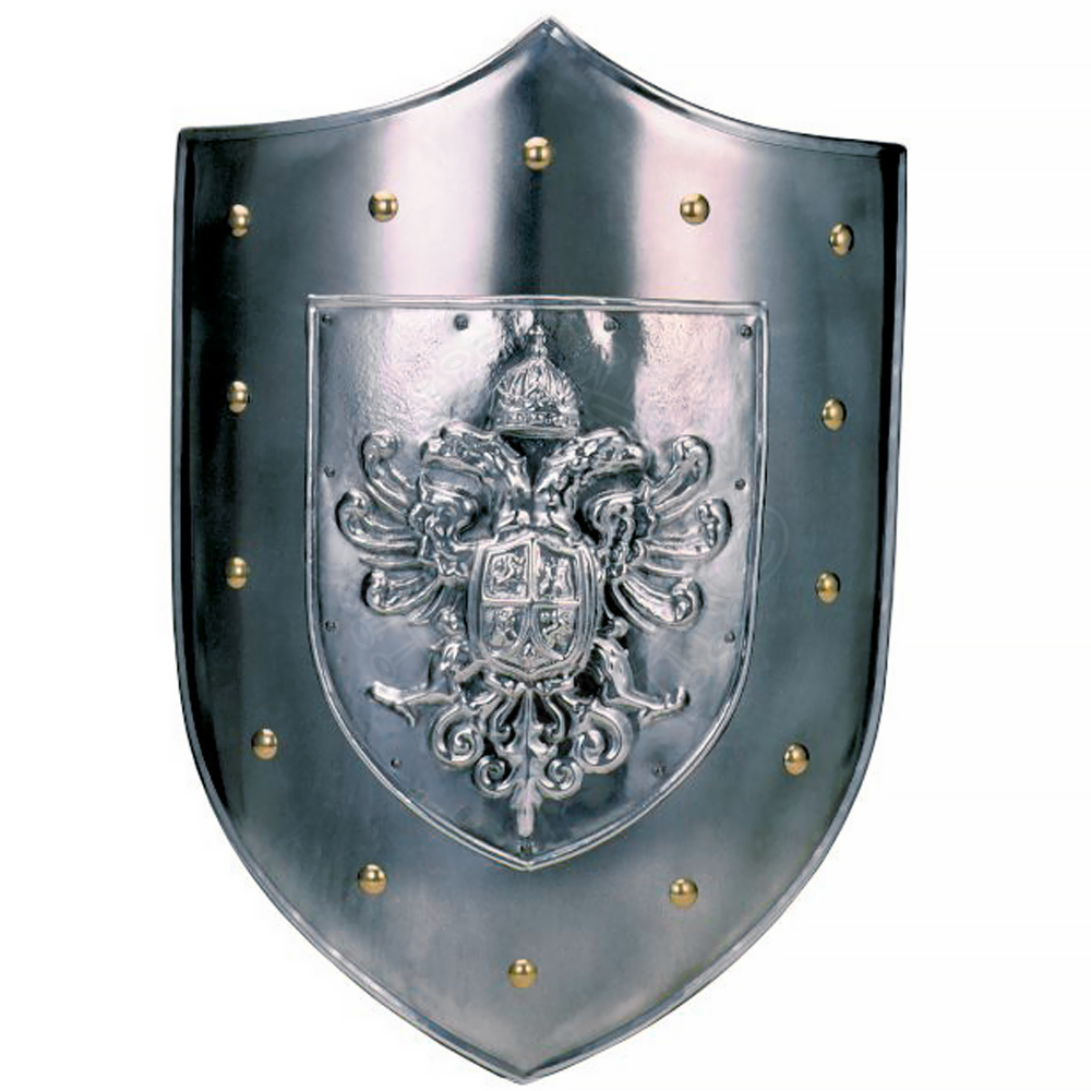 Der Schild in klassischer Form (Dreiecksschild) ist in Handarbeit aus Stahlblech gefertigt. Seine Oberfläche ist auf Hochglanz poliert, was ihm ein luxuriöses Aussehen verleiht. Das dominante Element ist die Reliefdarstellung des Doppeladlers mit Krone und Wappen auf der Brust. Dieses Symbol repräsentiert Macht, Wachsamkeit und die Verbindung von Ost und West. Die Ränder des Schildes sind mit einer Reihe dekorativer Messingnieten (oder goldfarbener Nieten) gesäumt, die einen schönen Kontrast zur silbernen Oberfläche des Stahls bilden.