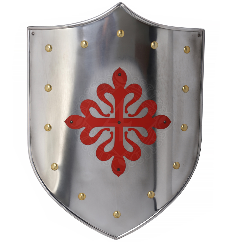 Das Herzstück des Schildes ist das leuchtend rote Kreuz der Ritter von Calatrava. Dieser Orden war der erste militärisch-religiöse Orden, der in Kastilien gegründet wurde (1158). Ihr Emblem ist ein griechisches Kreuz, dessen Arme in stilisierten Lilien (Fleur-de-Lis) enden. Das Rot auf dem silbernen (stählernen) Untergrund symbolisiert das Blut, das zur Verteidigung des Glaubens vergossen wurde.