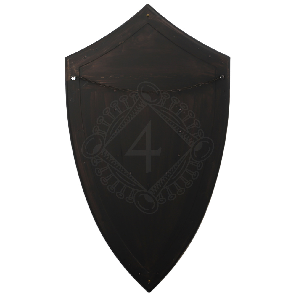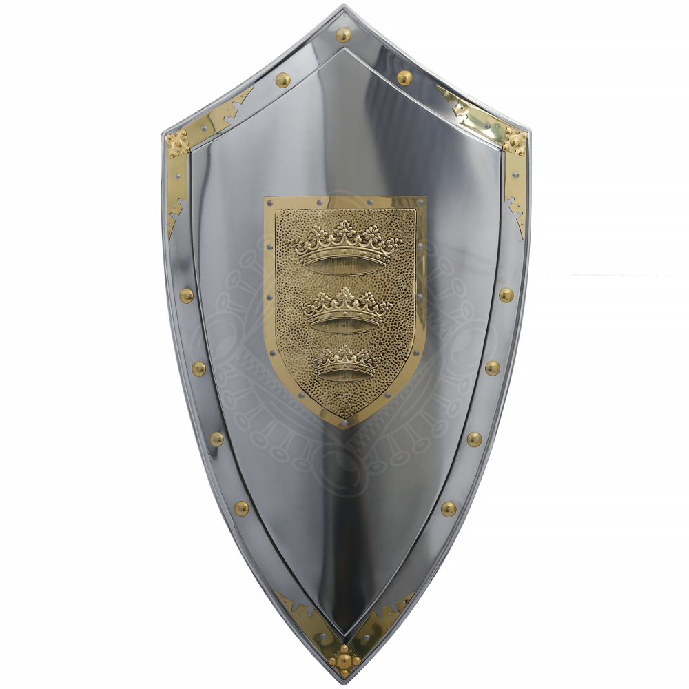 Das Herzstück des Schildes ist eine rechteckige Messingapplikation mit dem Relief von drei Kronen auf texturiertem Hintergrund. In der heraldischen Tradition wird dieses Wappen (oft auf blauem Feld, hier in luxuriöser Goldausführung) König Artus zugeschrieben. Die drei Kronen symbolisieren seine Herrschaft über drei Königreiche oder seinen Status als Großkönig. Die Ecken des Schildes sind zusätzlich mit Messingbeschlägen in floralem Design verziert, was dem Gesamtbild Eleganz verleiht.