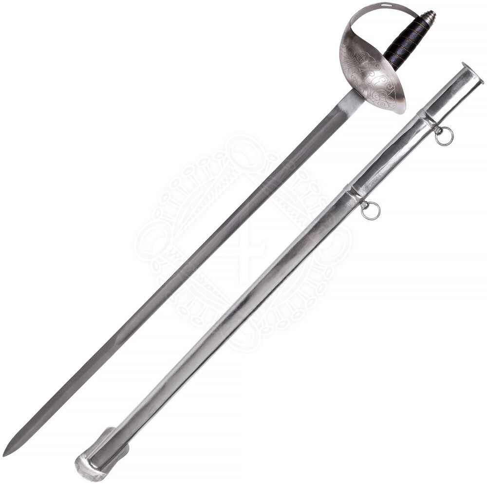 Geliefert wird das Kavallerieschwert samt passender Ganzstahl-Scheide mit zwei Ringbändern, beweglichen Tragringen und breitem, abgerundetem Endstück oder Schuh.