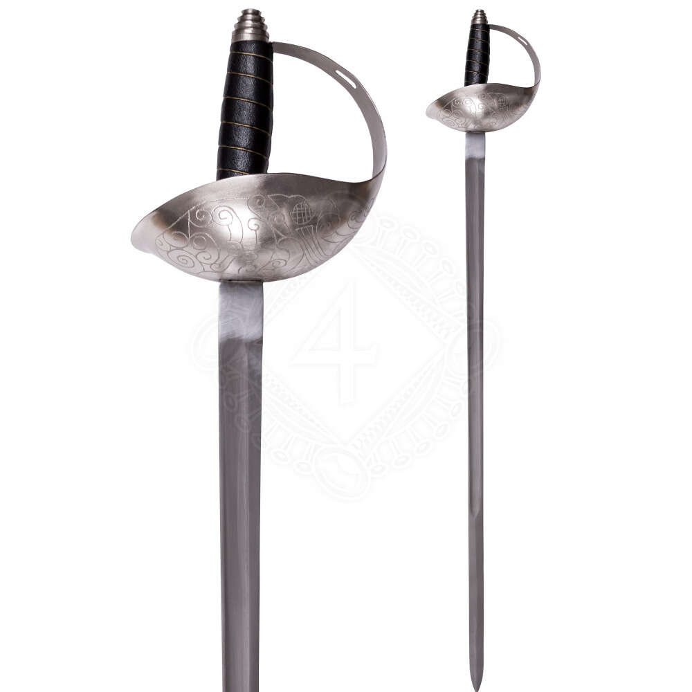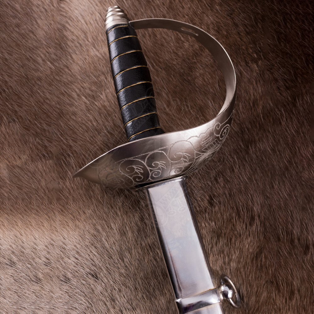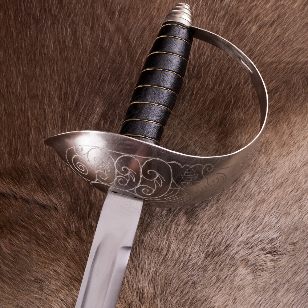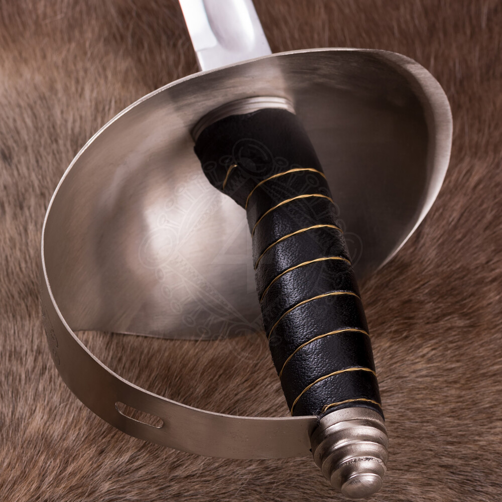 Die schöne, erschwingliche Rekonstruktion, die wir hier anbieten, besitzt eine gerade, einschneidige Klinge aus Federstahl EN45, die über etwa zwei Drittel ihrer Länge gekehlt ist. Die ungeschärfte Schneide ist ca. 1mm stark. Das Gefäß hat einen Handschutzbügel, und beim großzügigen, schalenförmigen Stichblatt wurden die Motive, die die historischen Vorbilder zierten, möglichst getreu nachgebildet. Das Griffstück mit Holzkern ist mit schwarzem Leder und verdrilltem Stahldraht umwickelt.