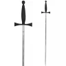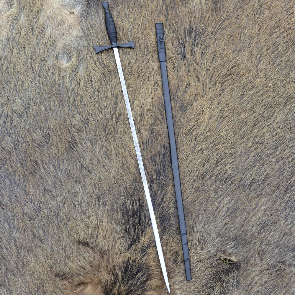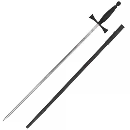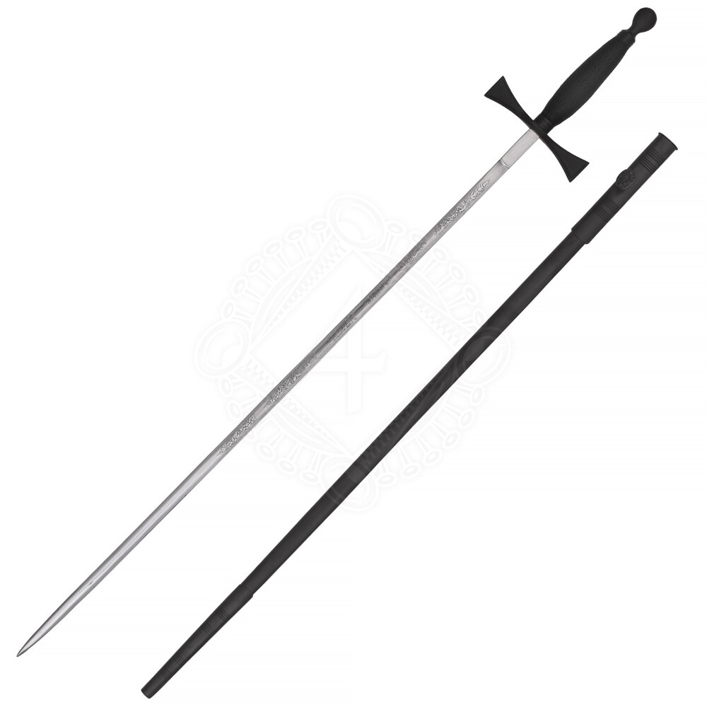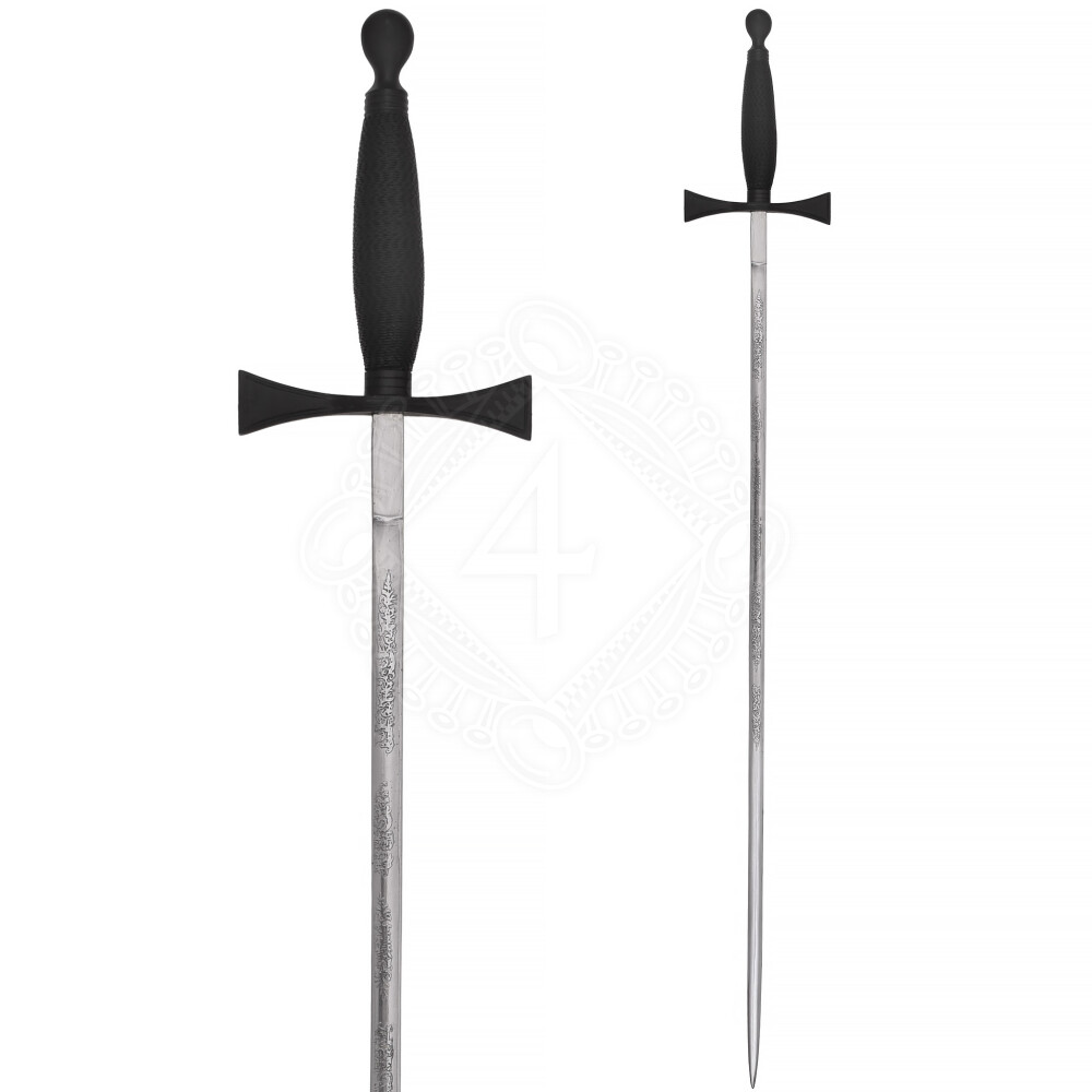 Dieses Schwert besticht durch seine konsequente Form- und Farbgebung. Die Parierstange ist in der Form von Tatzenkreuzarmen gearbeitet. Zusammen mit Klinge und Griff bildet sie das christliche Kreuz, in der Form wie es z.B. von den Tempelrittern verwendet wurde. Die ungeschärfte Klinge ist mit geätzten Verzierungen geschmückt.