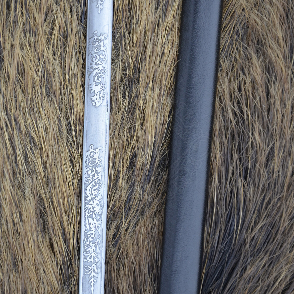 Das Schwert kommt mit einer passenden Scheide aus Stahl, die mit schwarzem Leder überzogen ist.