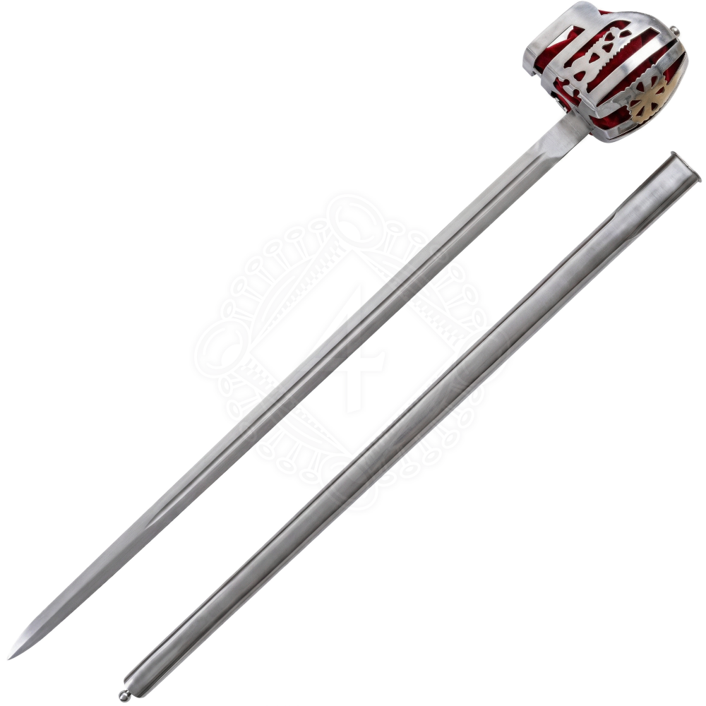 Das schottische Breitschwert, im Englischen als Basket-Hilt Broadsword bekannt, ist eine ikonische Waffe, deren charakteristischer Korb die Hand des Fechters im Kampf vollständig schützte. Dieses spezielle Modell verfügt über eine zweischneidige Klinge aus Karbonstahl, die mit einer eingeschmiedeten Hohlkehle (Blutrinne) versehen ist. Diese Hohlkehle dient dazu, das Gewicht der Klinge zu reduzieren, ohne ihre strukturelle Integrität zu beeinträchtigen. Der markanteste Teil ist jedoch das Gefäß. Der aufwendige Stahlkorb ist mit kunstvollen Durchbrüchen in Form von Herzen und geometrischen Mustern verziert, was ihn zu einem echten Kunstwerk macht. Die Innenseite des Korbes ist mit tiefrotem Samt ausgekleidet. Dies bildet nicht nur einen schönen visuellen Kontrast zum polierten Metall, sondern diente historisch auch dazu, die Hand vor Reibung und in den schottischen Wintern vor extremer Kälte zu schützen. Das Schwert wird mit einer komplett aus Metall gefertigten, polierten Scheide geliefert, die an der Spitze mit einem Ortknopf versehen ist – einem typischen Merkmal militärischer Schwerter des späten 18. Jahrhunderts.