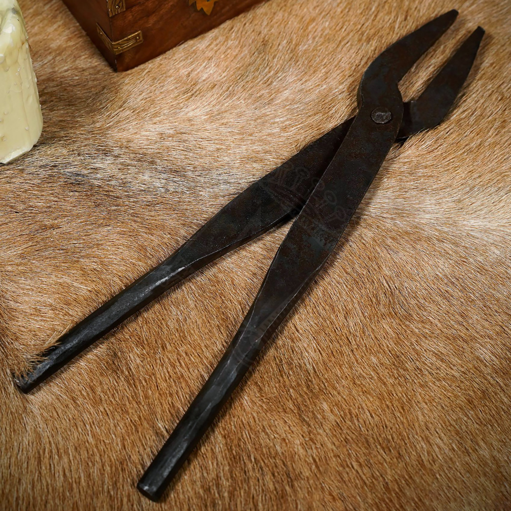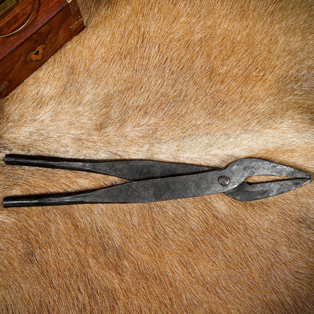Das Design dieser Zange ist seit Jahrhunderten bewährt. Die flachen Backen gewährleisten einen festen und stabilen Griff für eine Vielzahl von Gegenständen, von einem Flachstahl in der Schmiede bis zum Henkel eines Kessels über dem Lagerfeuer. Die langen Griffe bieten eine ausgezeichnete Hebelwirkung und Kontrolle, während der robuste Nietbolzen für eine reibungslose und zuverlässige Bewegung sorgt. Die Oberfläche der Zange ist in einem natürlichen Schmiedeschwarz belassen und oft mit Öl konserviert, was ihren rauen Charakter unterstreicht und sie vor Korrosion schützt.