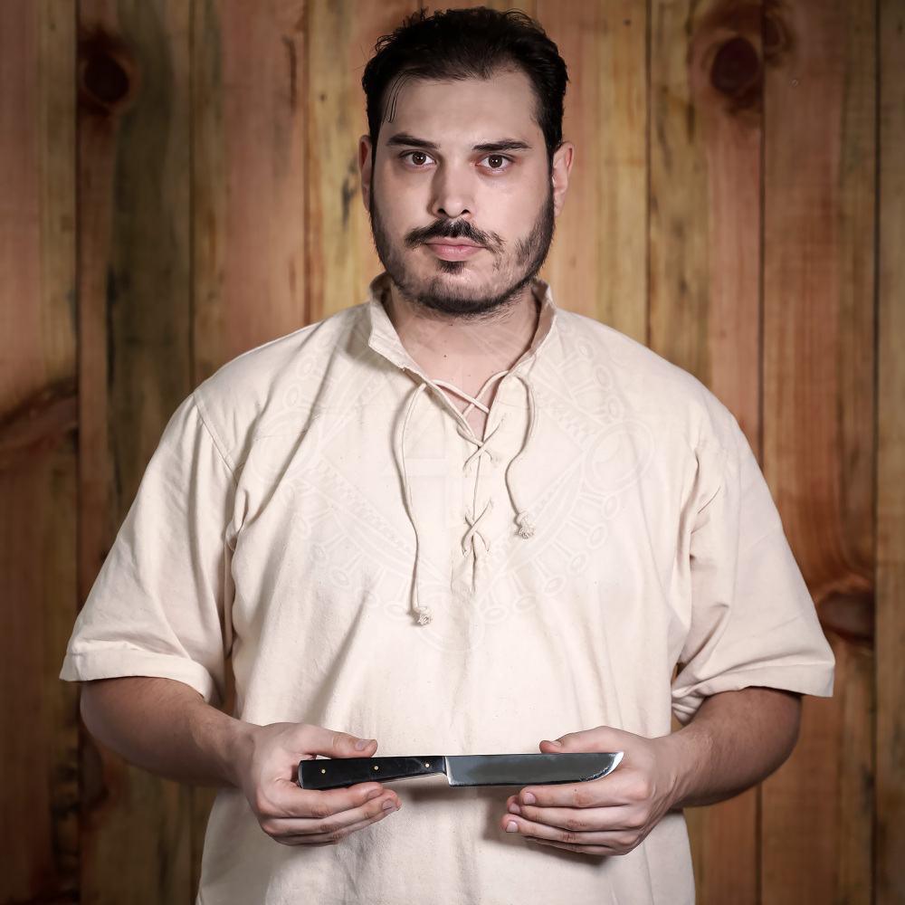 Suchst du einen zuverlässigen und authentisch wirkenden Helfer für deine Lagerküche auf einem Mittelaltermarkt, beim LARP oder bei SCA-Veranstaltungen? Wir präsentieren dir dieses praktische mittelalterliche Messer, das ein rustikales Erscheinungsbild mit den Vorteilen moderner Materialien verbindet. Die Klinge aus hochwertigem Edelstahl erleichtert die Pflege und garantiert eine hygienische Zubereitung von Speisen unter Feldbedingungen. Der Griff aus echtem Rinderhorn, der mit Messingnieten solide vernietet ist, verleiht dem Werkzeug den richtigen historischen Charakter. Das Messer wird zu deinem unverzichtbaren Begleiter, nicht nur beim Schneiden von Gemüse, Fleisch und Brot, sondern auch beim abendlichen Festmahl am Lagerfeuer. Erlebe die wahre Atmosphäre historischer Gelage mit einem Werkzeug, auf das du dich immer verlassen kannst. Weitere Produktinformationen ...
