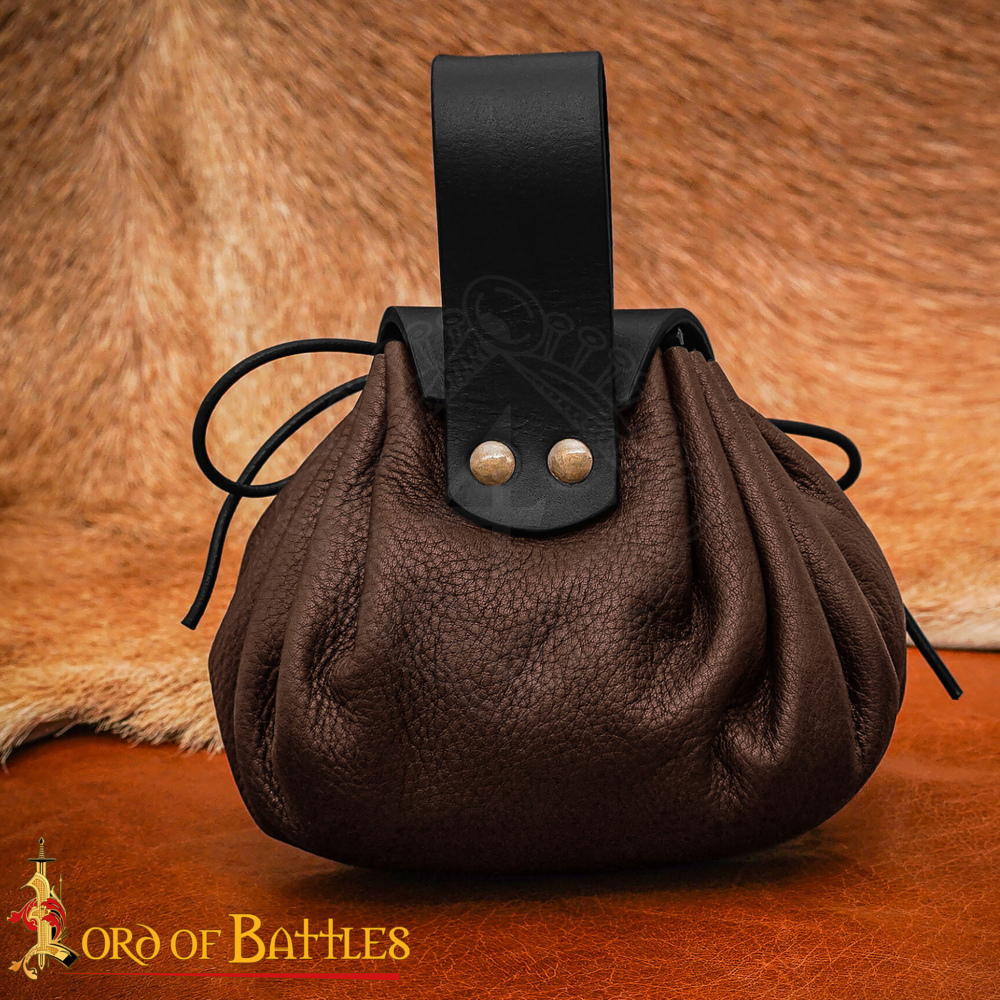 Im Hoch- und Spätmittelalter, insbesondere im 14. und 15. Jahrhundert, gab es praktisch keine fest in die Kleidung eingenähten Taschen. Alles Notwendige, was man ständig bei sich tragen wollte, wurde an den Gürtel gehängt. Gürteltaschen, Almosenbeutel und Taschen dieses Typs wurden von einfachen Bauern, Handwerkern, Bürgern und Söldnern in ganz Europa getragen. Sie dienten zur Aufbewahrung von Münzen, Feuerstahl, Zunder oder kleinen persönlichen Gegenständen. Die zweifarbige Gestaltung und die Materialkombination spiegeln die damalige Praxis wider, als oft Reste verschiedener Lederarten sinnvoll verwertet wurden.