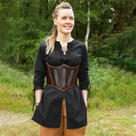 Obwohl klassische Korsetts mit Stäbchen, wie wir sie aus dem 17. bis 19. Jahrhundert kennen, für ein aktives Leben an Bord eines Schiffes absolut unpraktisch waren, existierten verschiedene Formen von Miedern und breiten Ledergürteln. Sie dienten nicht nur dem Schutz, sondern auch als Stütze für den Rücken bei schwerer Arbeit. Dieses Korsett ist eine Fantasy-Interpretation, die historische Ästhetik mit Praktikabilität verbindet. Es bietet Halt und formt die Figur, schränkt aber dank des Unterbrust-Schnitts weder die Atmung noch die Bewegung ein – was für das Überleben auf See entscheidend war.