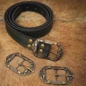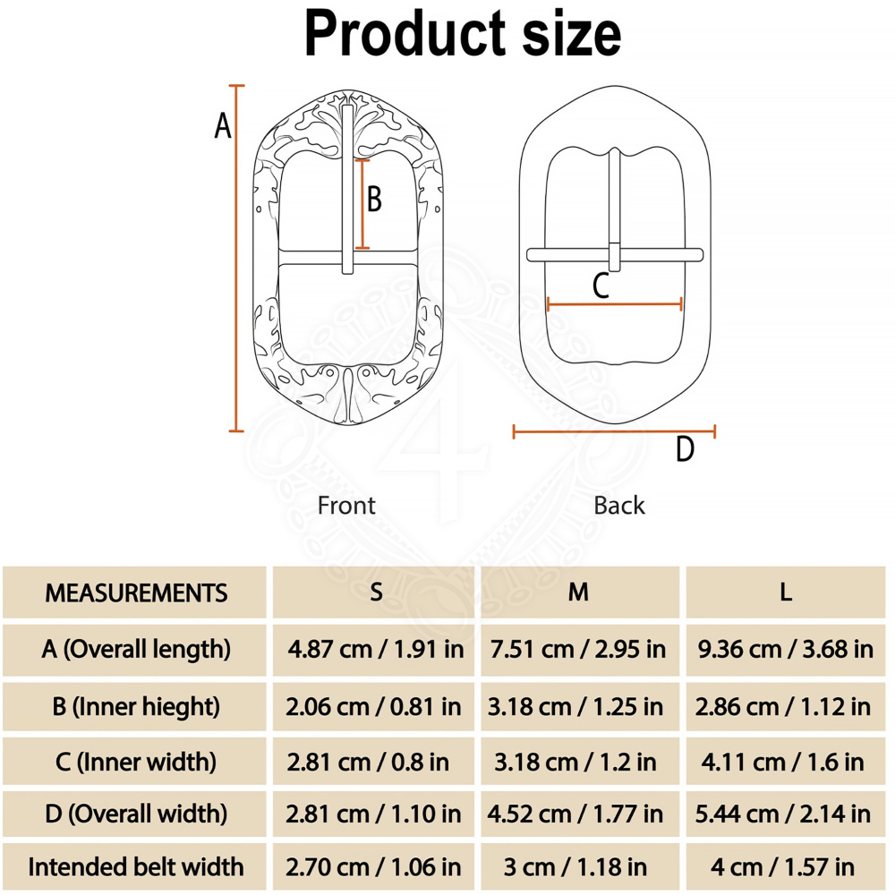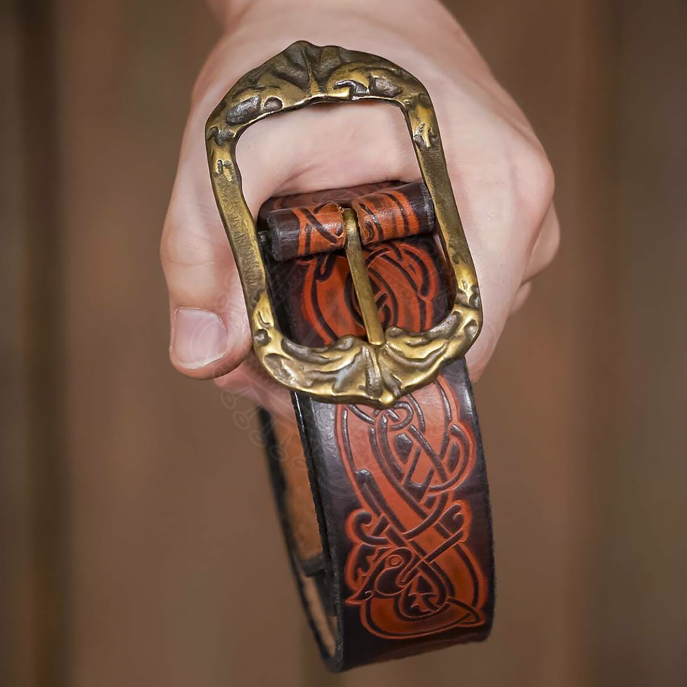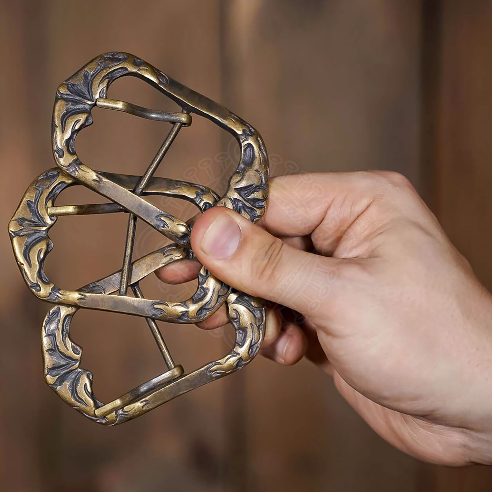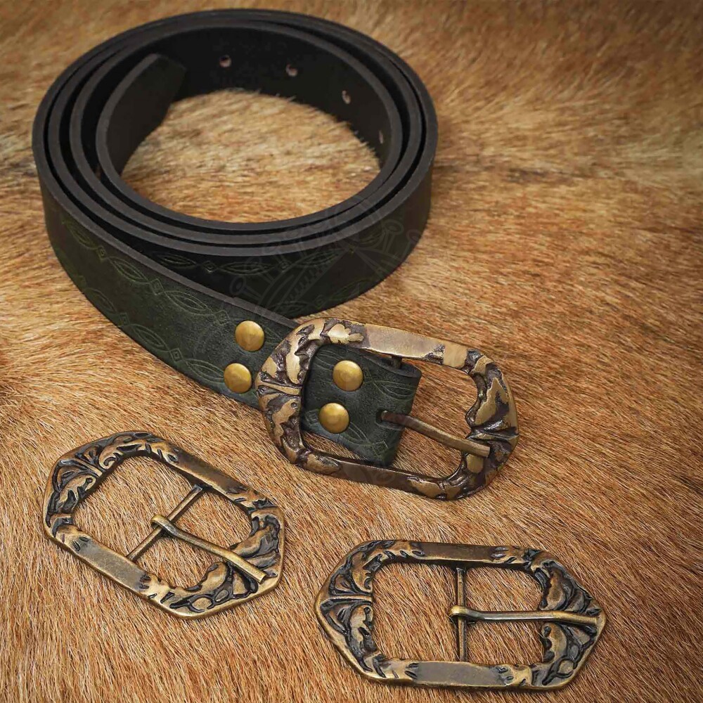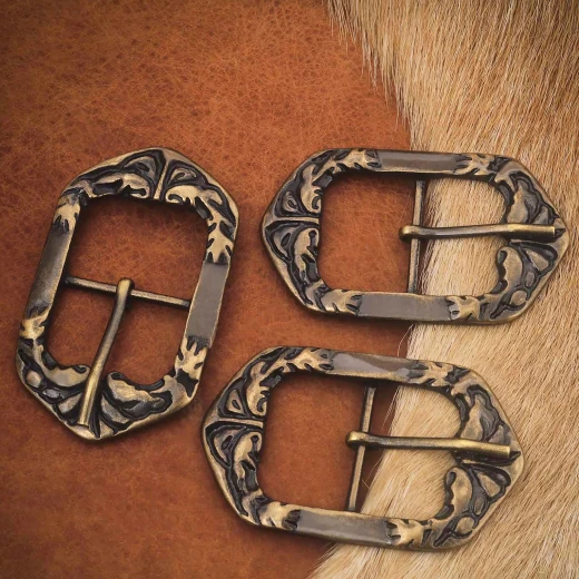 Jede Schnalle in diesem Set hat eine abgerundete rechteckige Form, die nicht nur elegant, sondern auch praktisch ist. Der Rahmen der Schnalle ist rundum mit einem aufwendigen reliefartigen Motiv aus verschlungenen Blättern und Ranken verziert, das typisch für die dekorative Kunst des Spätmittelalters ist. Das Finish mit einer dunklen, antiken Patina hebt die Details hervor und verleiht den Schnallen das Aussehen echter archäologischer Funde. Ein stabiler und einfacher Dorn sorgt für einen zuverlässigen und sicheren Verschluss.