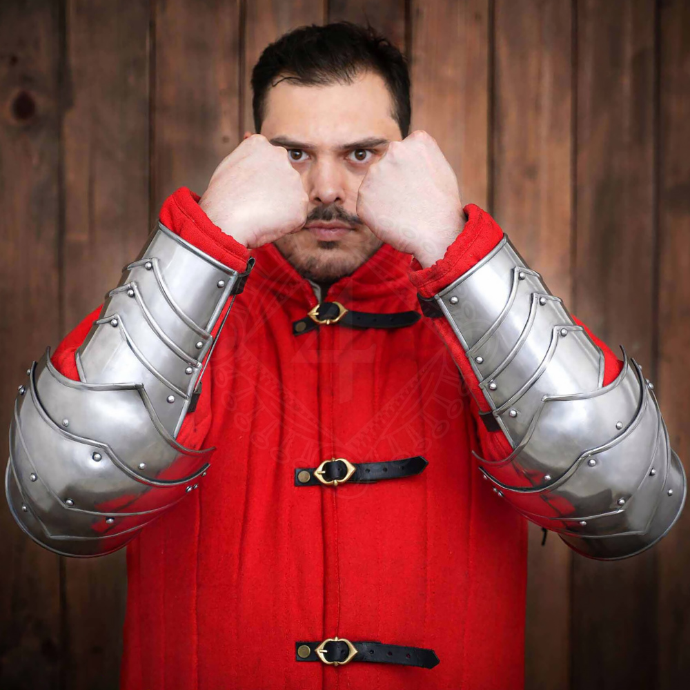 Bereite dich auf die Schlacht, das LARP oder das Reenactment mit diesen robusten Plattenarmen vor! Sie sind handgefertigt aus massivem 1,6 mm (16 Gauge) dickem Stahl und so konzipiert, dass sie zuverlässigen Schutz für den gesamten Arm bieten, ohne deine Beweglichkeit wesentlich einzuschränken. Dank ihrer soliden Konstruktion sind sie auch für anspruchsvolle Kontaktdisziplinen wie HMB (Buhurt) geeignet. Der gegliederte Ellbogenschutz sorgt für hervorragende Flexibilität, während anatomisch geformte Platten den Ober- und Unterarm abdecken. Zieh sie an und werde zum unaufhaltsamen Helden deiner eigenen Geschichte! Weitere Produktinformationen ...