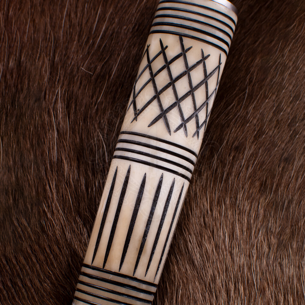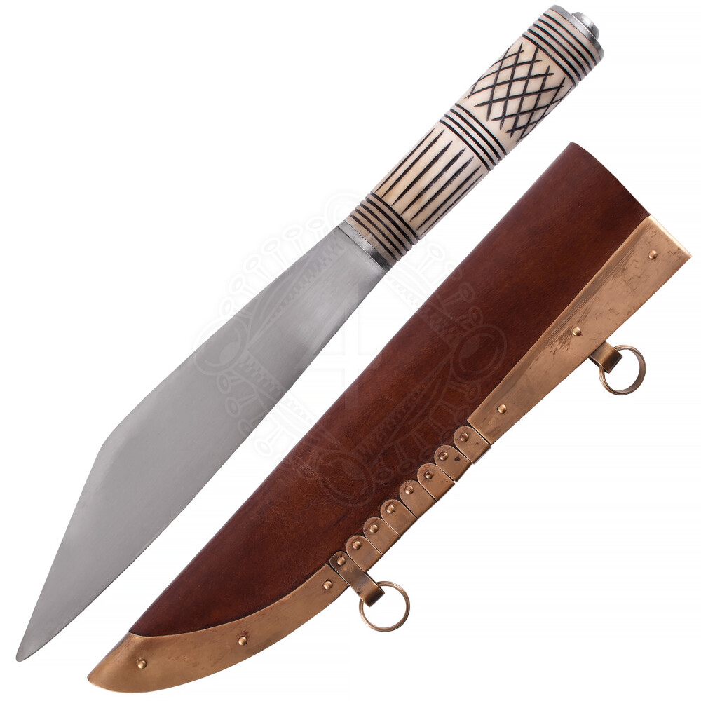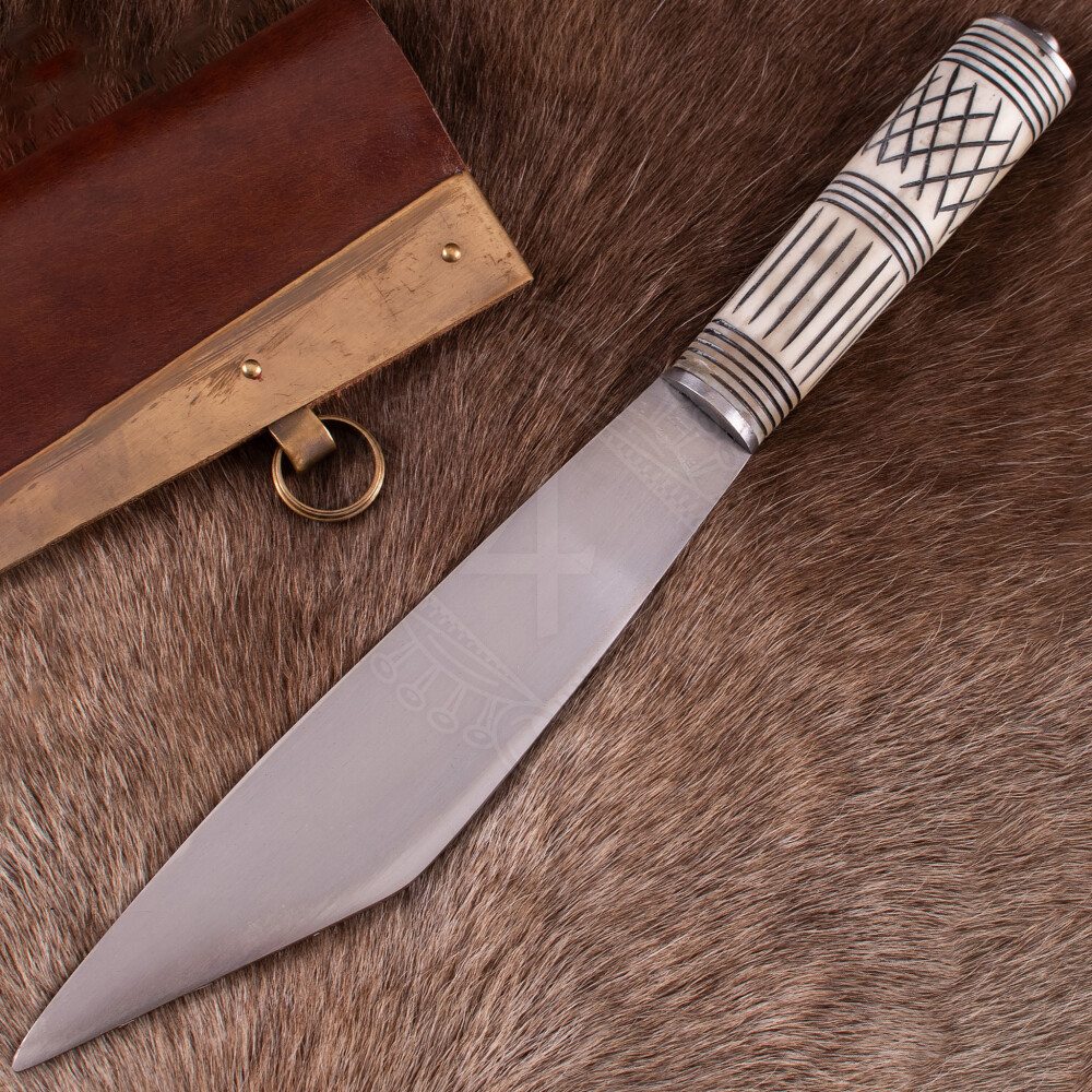 Dieser Kurzsax der Wikingerzeit, welcher aufgrund seiner besonderen Klingenform auch broken back Sax genannt wird, besitzt eine handgeschmiedete Klinge aus Kohlenstoffstahl EN45 mit kräftigem Rücken. Der eindrucksvolle Knochengriff ist poliert, mit kunstvollen Gravuren verziert, und schließt mit einer Zwinge und einer Griffkappe aus Stahl ab. Weitere Produktinformationen ...