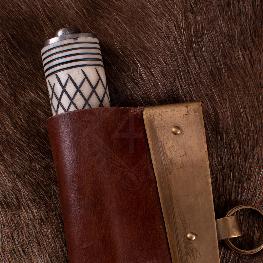 Im Lieferumfang enthalten ist eine Scheide aus kräftigem, vegetabil gegerbtem Leder mit Beschlägen – Verstärkungsplatten, Nieten und zwei Aufhänge-Ringen – aus Messing mit Antik-Finish.