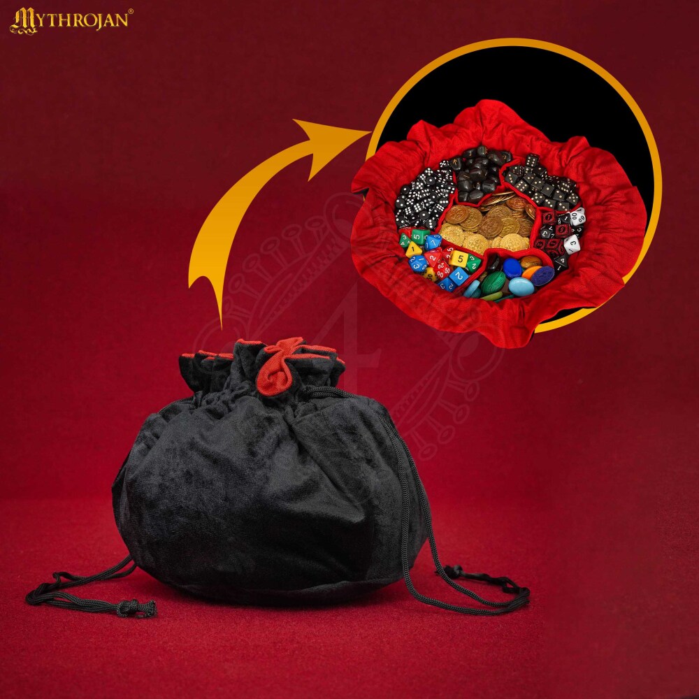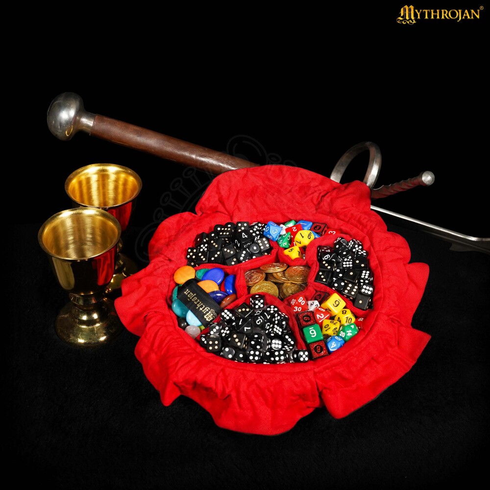 Vergiss das Suchen nach dem richtigen Würfel in einem einzigen großen Beutel. Die sieben Innentaschen ermöglichen es dir, deine Sets an polyedrischen Würfeln (W4, W6, W8, W10, W12, W20 und weitere) übersichtlich zu sortieren oder Spielwährung von Schlüsseln und anderen Wertsachen zu trennen. Ausgebreitet verwandelt sich der Beutel in eine praktische Unterlage, von der du bequem alles Nötige nehmen kannst, ohne dass etwas wegrollt. Er ist das ideale Zubehör für Spieler von Dungeons & Dragons (D&D), Das Schwarze Auge, aber auch für jeden historischen oder Fantasy-Charakter, der seine Wertsachen stilvoll und sicher aufbewahren muss.