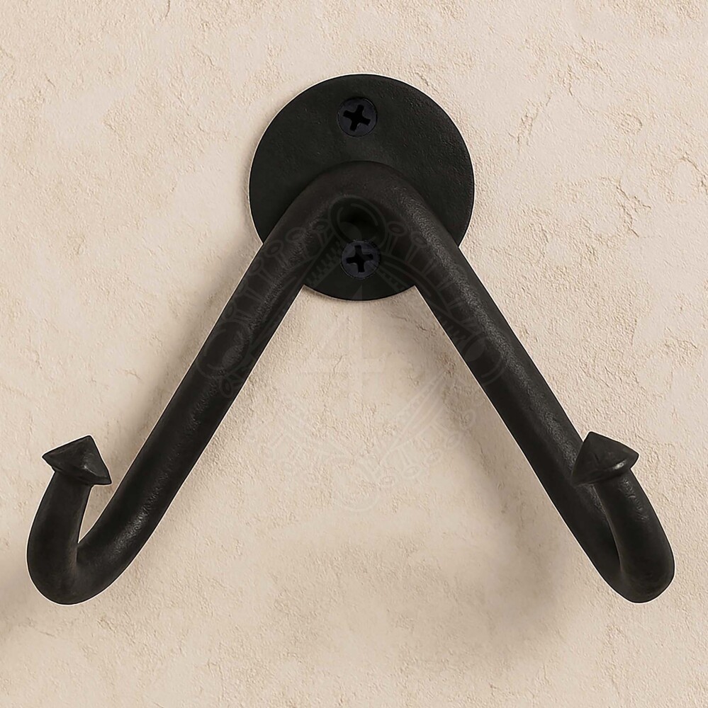 Der Halter ist aus massivem Baustahl gefertigt, was ihm eine außergewöhnliche Festigkeit und Langlebigkeit verleiht. Seine Oberfläche hat eine raue Textur und eine schwarze Farbe, die das Aussehen traditioneller, handgeschmiedeter Produkte imitiert und den Stahl gleichzeitig vor Korrosion schützt. Jedes Stück ist durch leichte Abweichungen in Form und Oberfläche ein Unikat, was seinen rustikalen, mittelalterlichen Charakter unterstreicht.