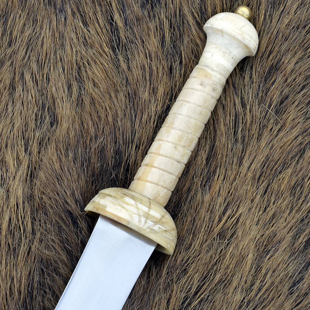 Dieser Gladiatorendolch ist eine sehr schöne Replik einer Waffe, die bei Ausgrabungen in Pompeji entdeckt wurde. Die Stadt Pompeji wurde im Jahre 79 n. Chr. durch den Ausbruch des Vesuvs weitestgehend zerstört und unter einer 4 - 6 Meter dicken Ascheschicht begraben. Es ist heute ein Eldorado für Archäologen. Der Dolch besitzt eine sehr detailgetreue, handgefertigte Griffpartie aus Knochen. Die Klinge ist aus Karbonstahl geschmiedet. Sie ist ungeschärft und somit perfekt für den Sammler als auch für Kampfdarstellungen. Eine Scheide ist nicht erhältlich, da Gladiatorenwaffen in die Arena getragen wurden. Da der Griff aus natürlich gewachsenem Tierknochen besteht, sind kleine Risse im Material möglich und völlig normal. Solche kleinen Fehler wirken authentisch, natürlich und einzigartig zugleich und verringern nicht die Qualität oder die Festigkeit des Griffes.