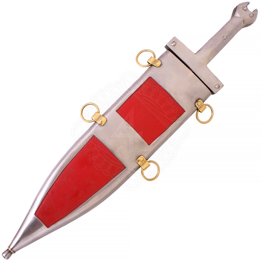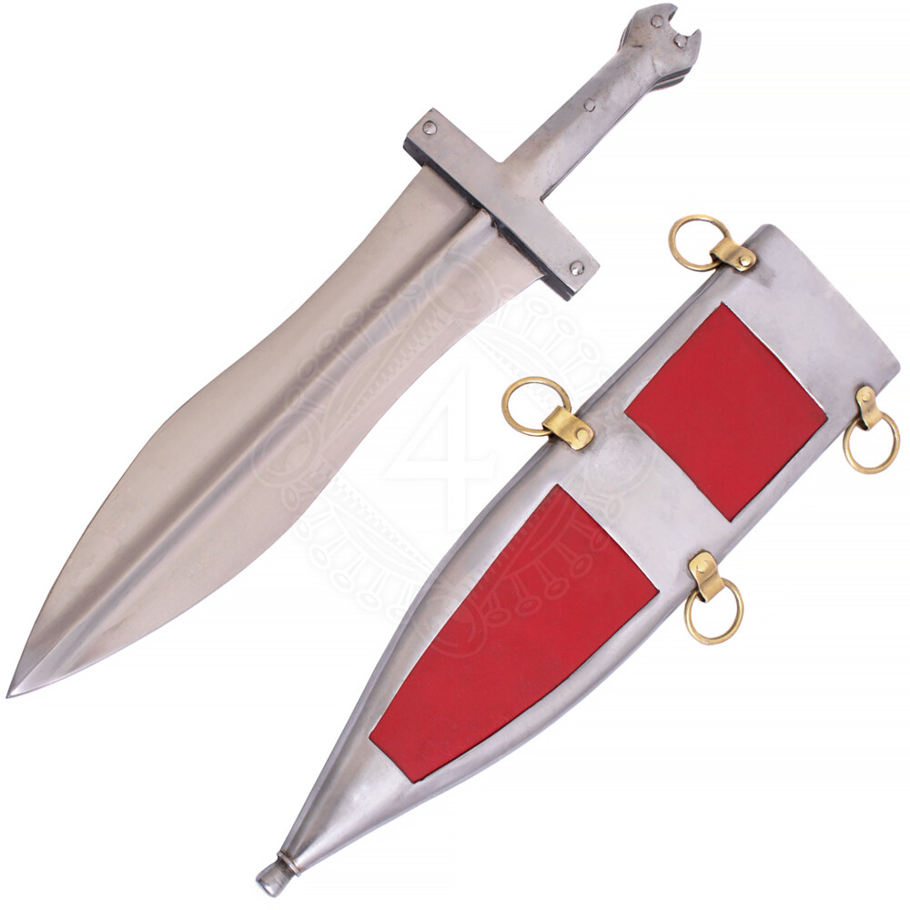 Replik eines spätrömischen Dolches, der einem Fund im Römerkastell bei Künzing (Niederbayern) nachempfunden ist. Der Fund wird auf das 3. Jahrhundert datiert. Im Lieferumfang enthalten ist eine hölzerne Scheide mit Lederbezug und Beschlägen aus Stahl und Messing. Weitere Produktinformationen ...