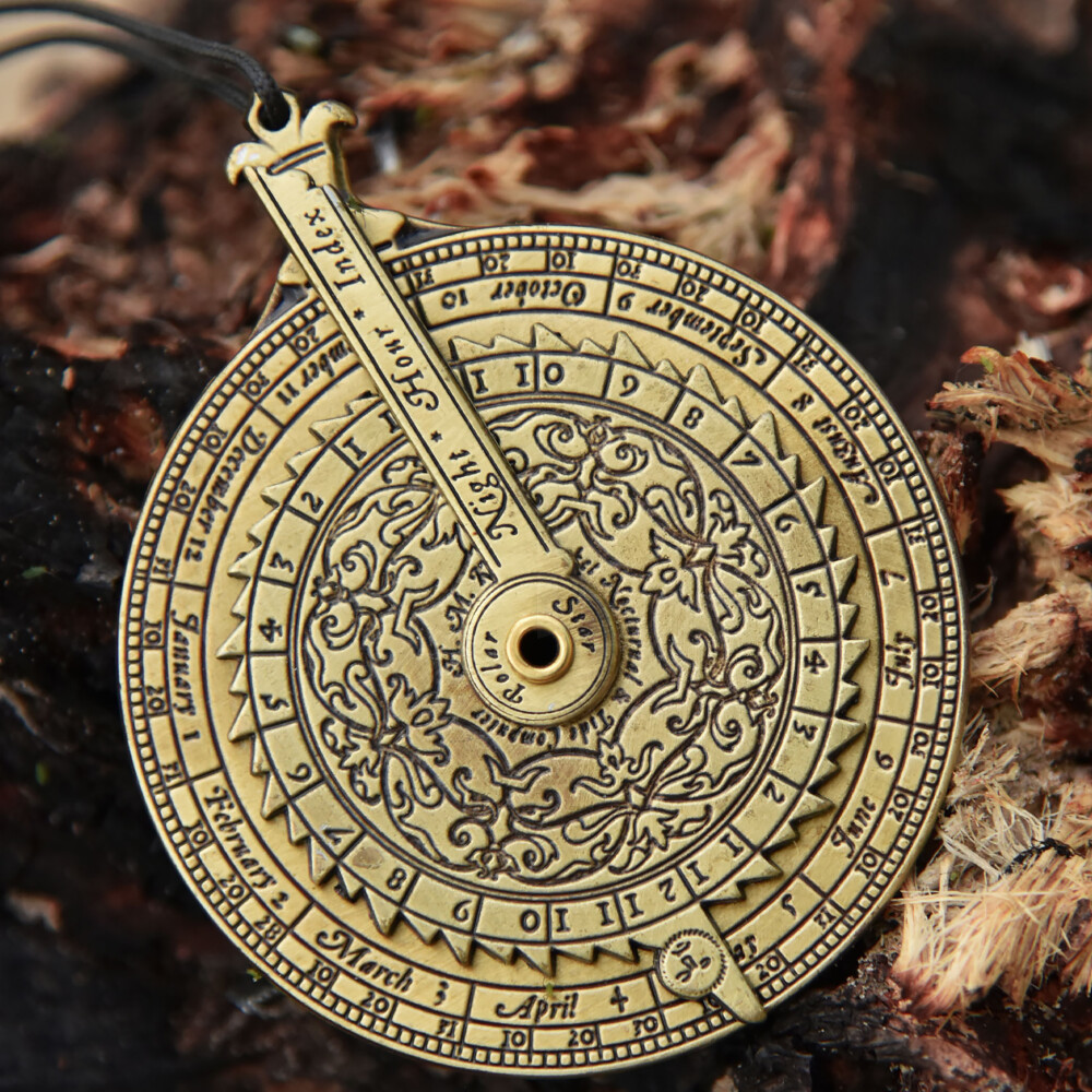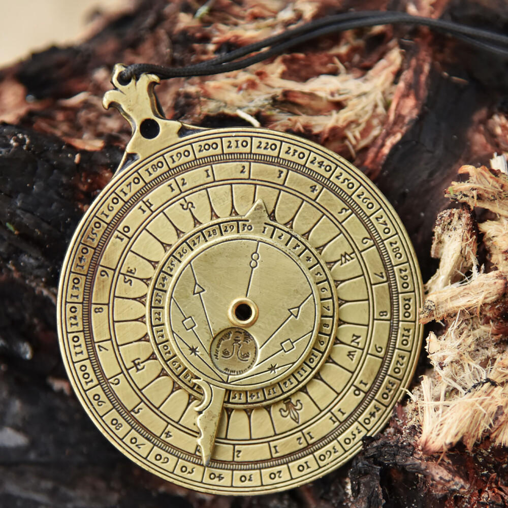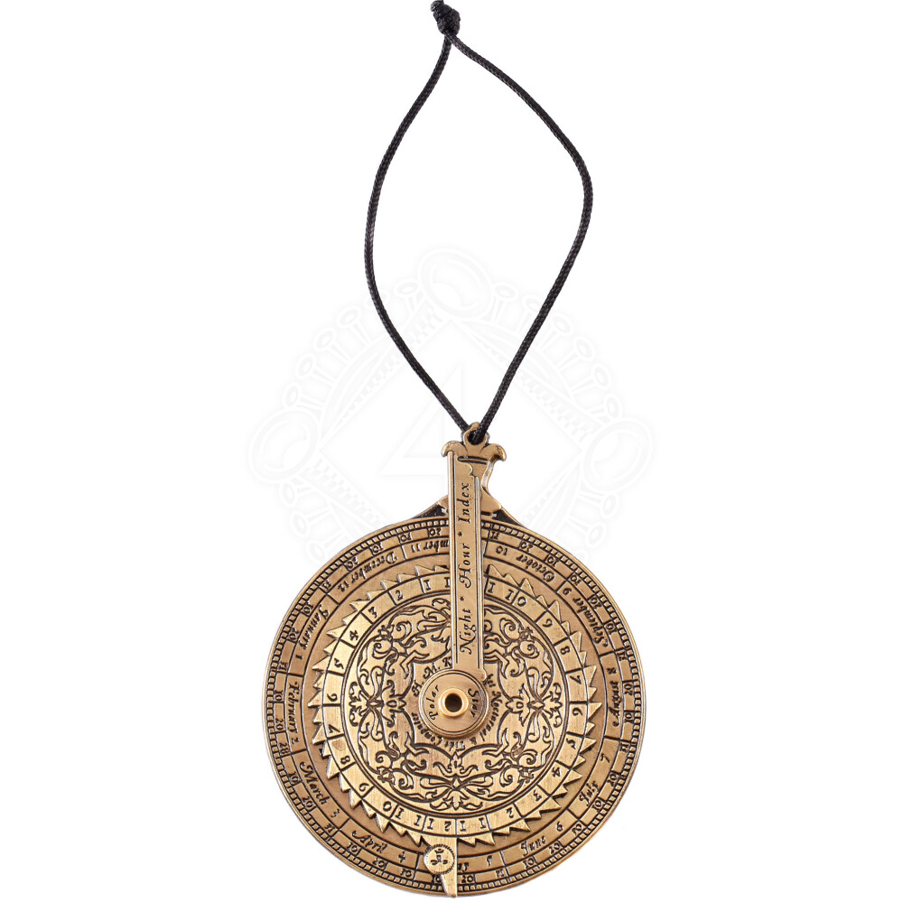 Die Sternuhr, auch Nokturnal oder Nocturnal genannt, wird verwendet, um nachts die Zeit mit Hilfe von Fixsternen der nördlichen Hemisphäre zu ermitteln. Auf ihrer Rückseite befindet sich ein historischer Rechner, der Dir hilft, die Hochwasserzeiten an Deinem Standort zu bestimmen. Dieses tragbare Nokturnal aus Messing ist völlig funktionsfähig und in nur wenigen Schritten einsetzbar. Als Schmuck-Anhänger oder Amulett ist es ein absoluter Hingucker, der Deine mittelalterliche Gewandung auf wunderschöner Weise vervollständigen wird. Weitere Produktinformationen ...