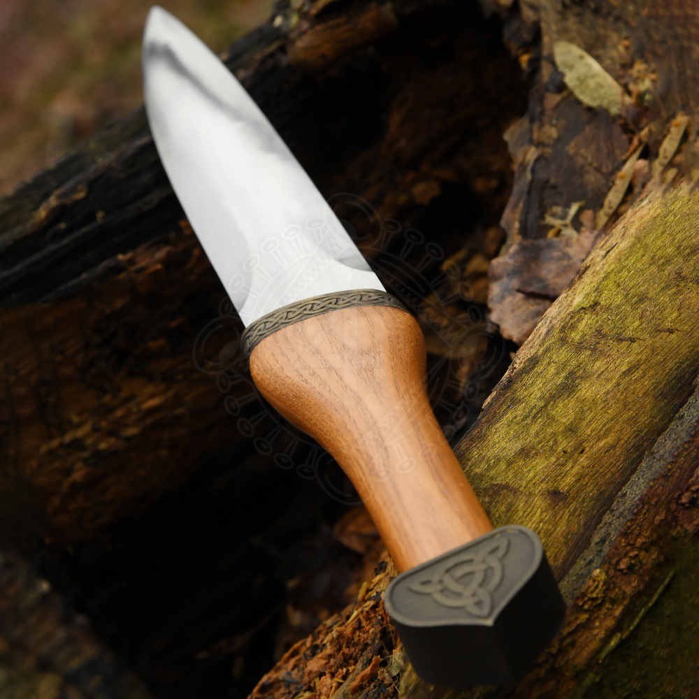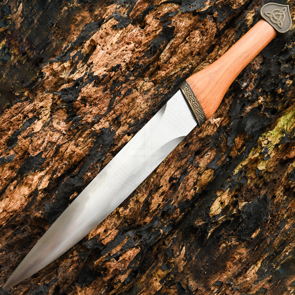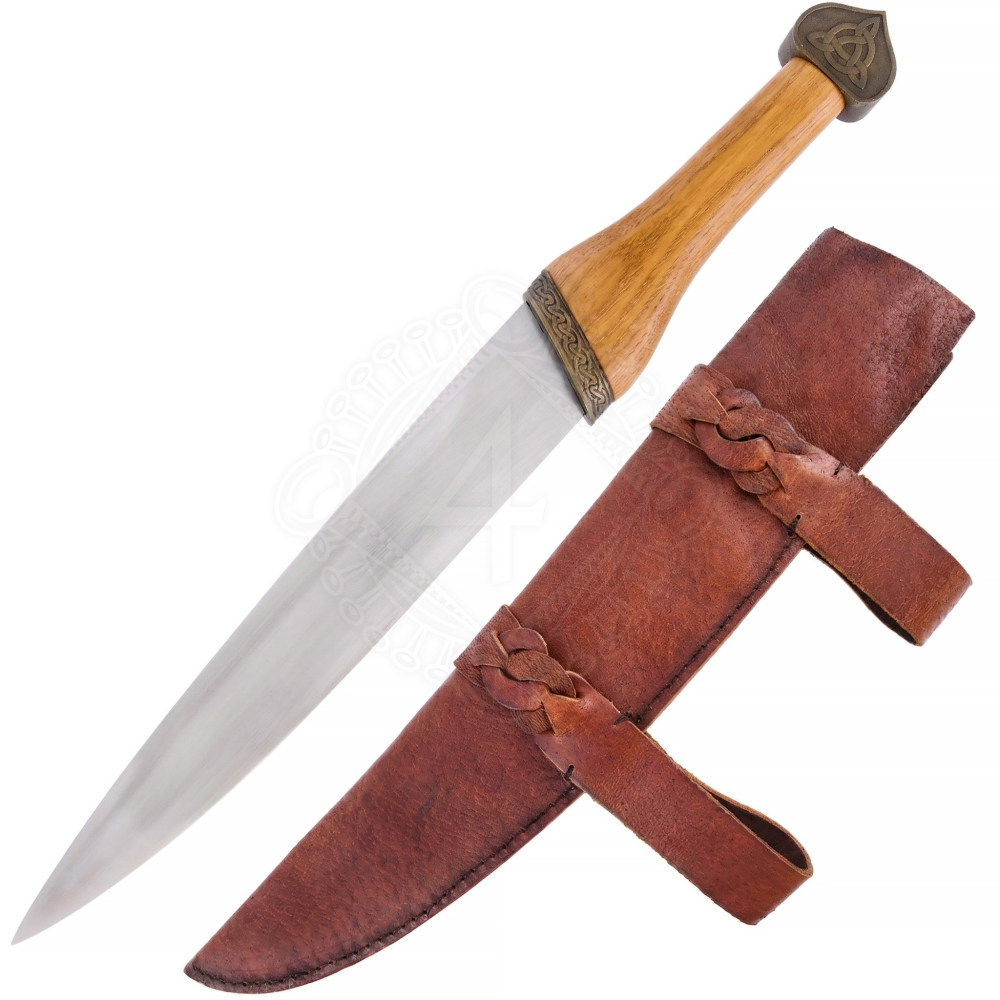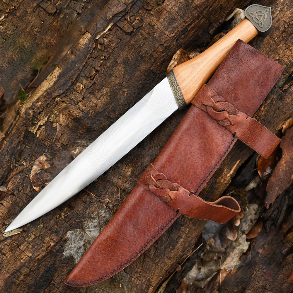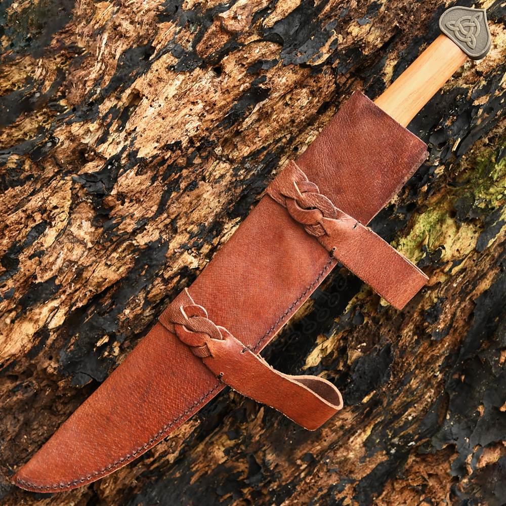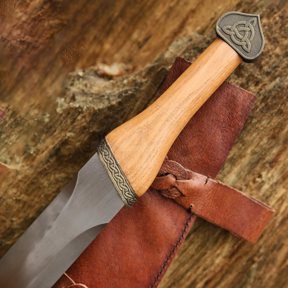 Die Waffe ist sorgfältig konstruiert, um sowohl historische Authentizität als auch praktische Funktionalität zu gewährleisten. Die massive Klinge ist aus elastischem 1566er Kohlenstoffstahl geschmiedet und weist das klassische Profil mit gerader Schneide auf. Der Griff ist aus Hartholz gefertigt, ergonomisch geformt und in der Mitte leicht verbreitert, um einen festen und sicheren Halt zu bieten. Ein markantes optisches Element sind das Parierelement und der Knauf mit ihrer antiken Patina. Auf der Zwinge ist ein detailliertes Relief eines keltischen Knotenmusters eingeprägt, während der Knauf vom Symbol der Triquetra dominiert wird, einem uralten Zeichen, das oft mit der Dreifaltigkeit, der Ewigkeit und dem endlosen Lauf der Zeit in Verbindung gebracht wird. Die dicke braune Lederscheide ist mit Schlaufen versehen, die kunstvoll mit traditionellem Ledergeflecht verziert sind.