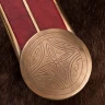 Geliefert wird der römische Einhänder samt roter Holz-/Lederscheide mit Beschlägen aus Messing – einem Mundband, einem kreisförmigen Ortblech, einem Rahmen bzw. einer durchgehenden seitlichen Einfassung und einem dekorativen Mittelgrat mit integriertem Riemendurchzug zum Tragen am Gürtel oder Bandelier (max. Riemenbreite ca. 4,5cm). Das auffallendste Merkmal dieser Scheide ist offensichtlich die überdurchschnittlich große, runde Platte oder Scheibe am unteren Ende (auch Dosenband genannt), die mit einem Rosettenmotiv kunstvoll graviert ist.