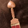 Diese Spatha ist keine Eins-zu-eins-Nachbildung eines historischen Vorbildes, sondern eine Rekonstruktion, die auf Originalfunden aus dem 2. und 3. Jh. basiert. Das römische Langschwert, das wir hier anbieten, besitzt eine breite, zweischneidige Klinge aus Federstahl EN45 mit zwei Hohlkehlen auf jeder Seite und einer ca. 5cm langen Fehlschärfe unterhalb des Pariers. Die Schneiden sind nicht geschärft und die durchgehende Klingenangel ist am Griffende verschraubt (Gewindemutter aus Messing). Das Heft mit großzügigem Knauf ist aus Holz gefertigt und mit Messingakzenten versehen. Die Griffpartie ist mit Schnitzereien verziert und das Parierstück ist klingenseitig mit einer Schutzplatte aus Messing ausgestattet. Weitere Produktinformationen ...
