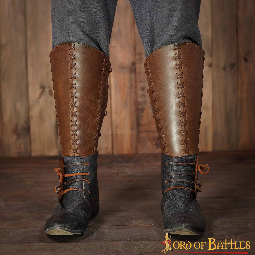 Die Beinschienen haben ein einfaches, aber funktionales und historisch anmutendes Design. Es handelt sich um anatomisch geformte Lederstücke, die sich der Form von Wade und Schienbein anpassen. Im oberen Bereich sind sie breiter und werden zum Knöchel hin schmaler, was einen bequemen Sitz gewährleistet. Sie sind in zwei Farbvarianten erhältlich, die sich auch in der Art der Schnürung unterscheiden: