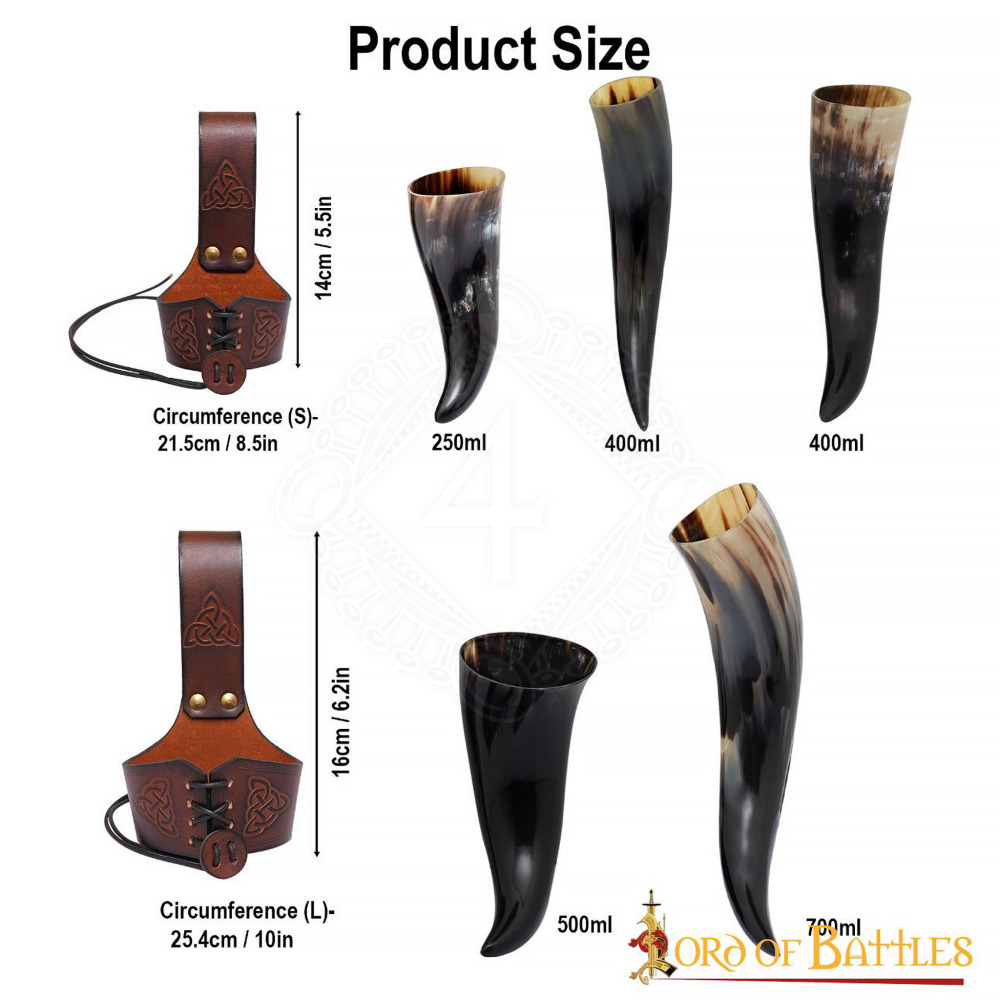 Die natürlichen Büffelhörner, die zur Herstellung dieser Trinkhörner verwendet werden, stammen aus ethischen Quellen. Das Trinkhorn ist in 4 Größen erhältlich:
