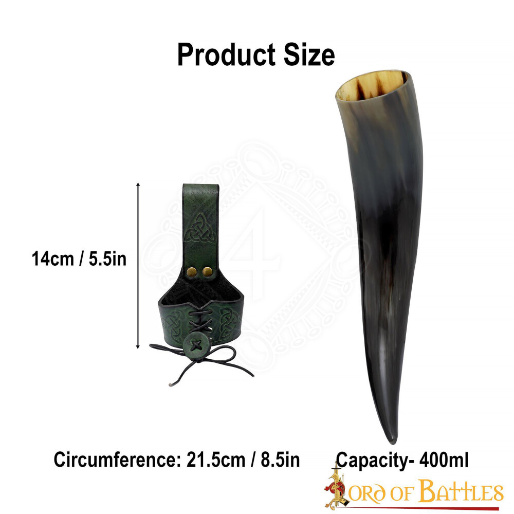 Ein hochwertiges Trinkhorn wie dieses könnte sich auf Ihren Reisen zu historischen Ereignissen als nützlich erweisen. Sein Gürtelhalter ist mit geprägten keltischen Knoten verziert. So können Sie stilvoll trinken! Dieses Trinkhorn hat eine glatt polierte Oberfläche ohne dekorative Gravuren. Weitere Produktinformationen ...