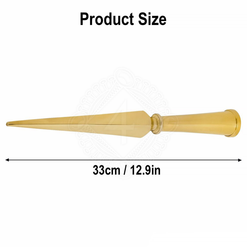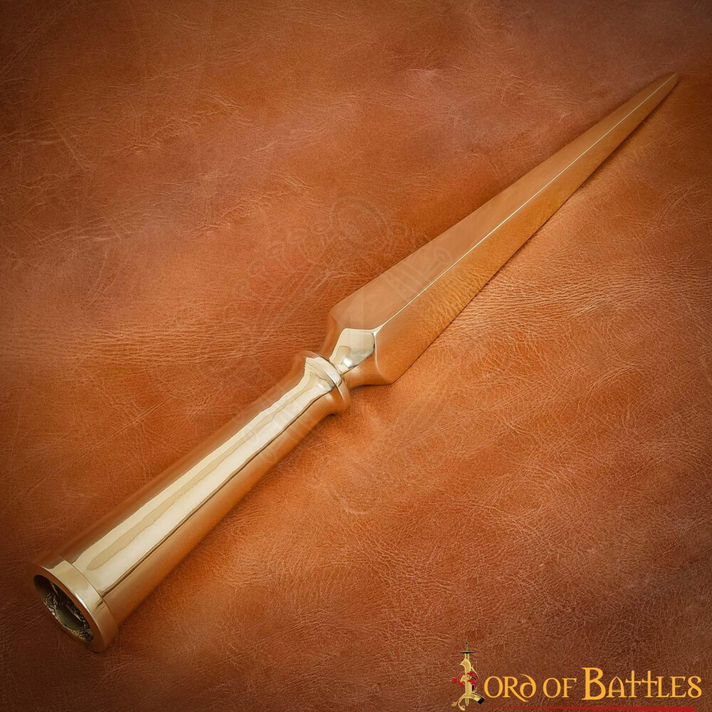 Diese Replik eines römischen Speerdorns ist aus massivem Messing gefertigt, was ihr einen goldenen Glanz sowie ein solides Gewicht und eine robuste Bauweise verleiht. Ihr Design besteht aus zwei Hauptteilen: der hohlen Tülle und einer scharfen, sich verjüngenden Spitze. Die Tülle hat die Form eines leicht konischen Rohrs, das am Ende in einen verzierten Ring übergeht. Am gegenüberliegenden Ende befindet sich ein eleganter Übergangsring, der die Tülle mit dem Dorn verbindet. Der Dorn selbst, der aus dem Ring herausragt, hat einen vierkantigen Querschnitt und ist präzise zu einer Spitze geformt. Die Gesamtlänge von 33 cm und das Gewicht von 692 g sorgen dafür, dass der Dorn als perfektes Gegengewicht zur schweren Speerspitze auf der anderen Seite des Schafts dient, was die Handhabung der Waffe erleichtert.