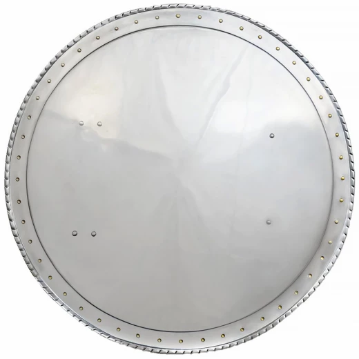 Dieser polierte Schild ist aus robustem, 1,2mm starkem Baustahl handgefertigt und hat einen Durchmesser von ca. 53cm. Auf der Rückseite sind zwei Lederriemen fest an einem schwarzen gepolsterten Streifen befestigt (einer der Riemen ist durch eine Stahlschnalle verstellbar).