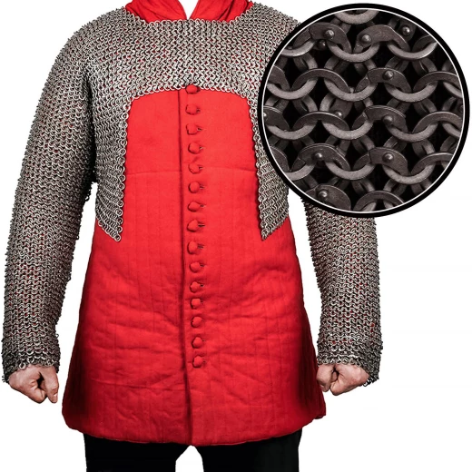 Suchst du den perfekten Schutz für Arme, Schultern und Hüften, wenn dein Rumpf bereits zuverlässig durch einen Kürass oder eine Brigantine geschützt ist und ein komplettes Kettenhemd nur unnötige Last wäre? Diese präzise gefertigten Kettenhemd-Voiders von Lord Of Battles® sind genau das, was du brauchst! Inspiriert von Originalen des 14. und 15. Jahrhunderts, bieten sie eine clevere Kombination aus Schutz und Beweglichkeit. Wie du auf der Detailaufnahme sehen kannst, sind sie aus flachen Stahlringen mit einem Innendurchmesser von 6 mm (Drahtstärke 1,0 mm / 18 Gauge) gefertigt. Für maximale Widerstandsfähigkeit wechseln sich hier Reihen von Flachringen, die sorgfältig mit Halbrundnieten vernietet sind, mit Reihen von festen (vollen) Flachringen ab. Das Ergebnis ist ein leichter, aber außerordentlich stabiler Schutz für deine nächsten historischen Schlachten oder LARP-Abenteuer. Geliefert in Naturfinish-Stahl, leicht eingeölt. Weitere Produktinformationen ...