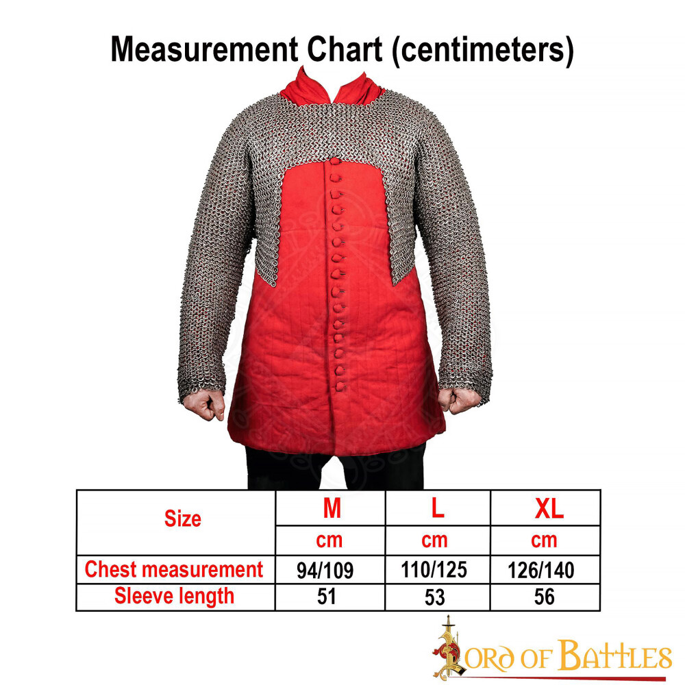 Dieser Kettenschutz wird in den Größen M, L, XL und XXL geliefert, um einem möglichst breiten Spektrum von Kämpfern gerecht zu werden. Die genauen Maße der einzelnen Größen (wie Schulterumfang, Ärmellänge und Länge des Seitenschutzes) findest du in der Größentabelle, die üblicherweise beim Produkt auf der Händlerseite oder direkt auf einem Zusatzbild des Herstellers zu finden ist.