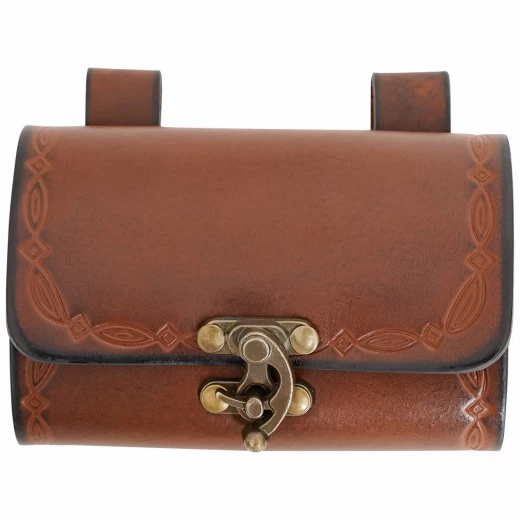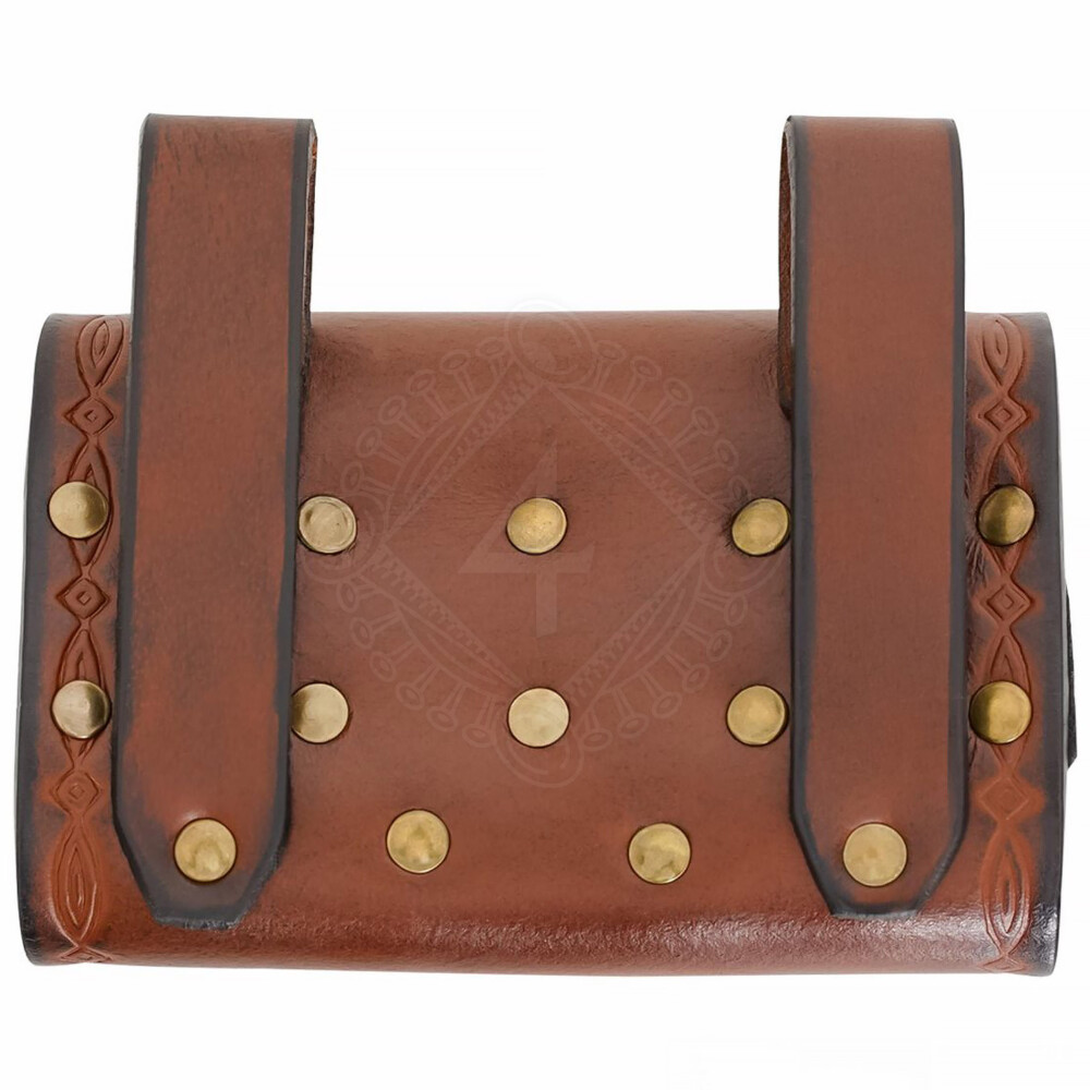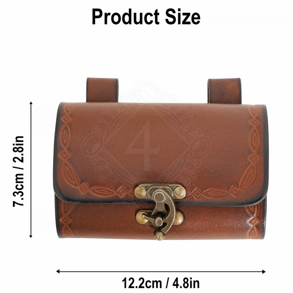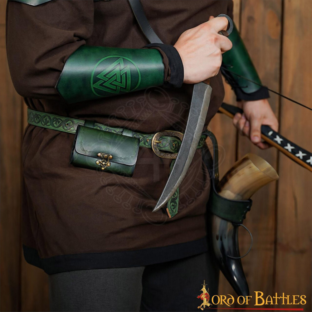 Die Tasche ist aus hochwertigem und festem Echtleder gefertigt, das in mehreren Farbvarianten (Braun, Grün, Weinrot) erhältlich ist, um perfekt zu deinem Kostüm zu passen. Die Klappe und die Seiten sind mit einem geschmackvollen Prägemuster verziert, das von keltischer und elbischer Kunst inspiriert ist. Zwei stabile Schlaufen auf der Rückseite ermöglichen das Tragen an Gürteln mit einer Breite von bis zu 7,5 cm, was einen stabilen und bequemen Sitz gewährleistet.