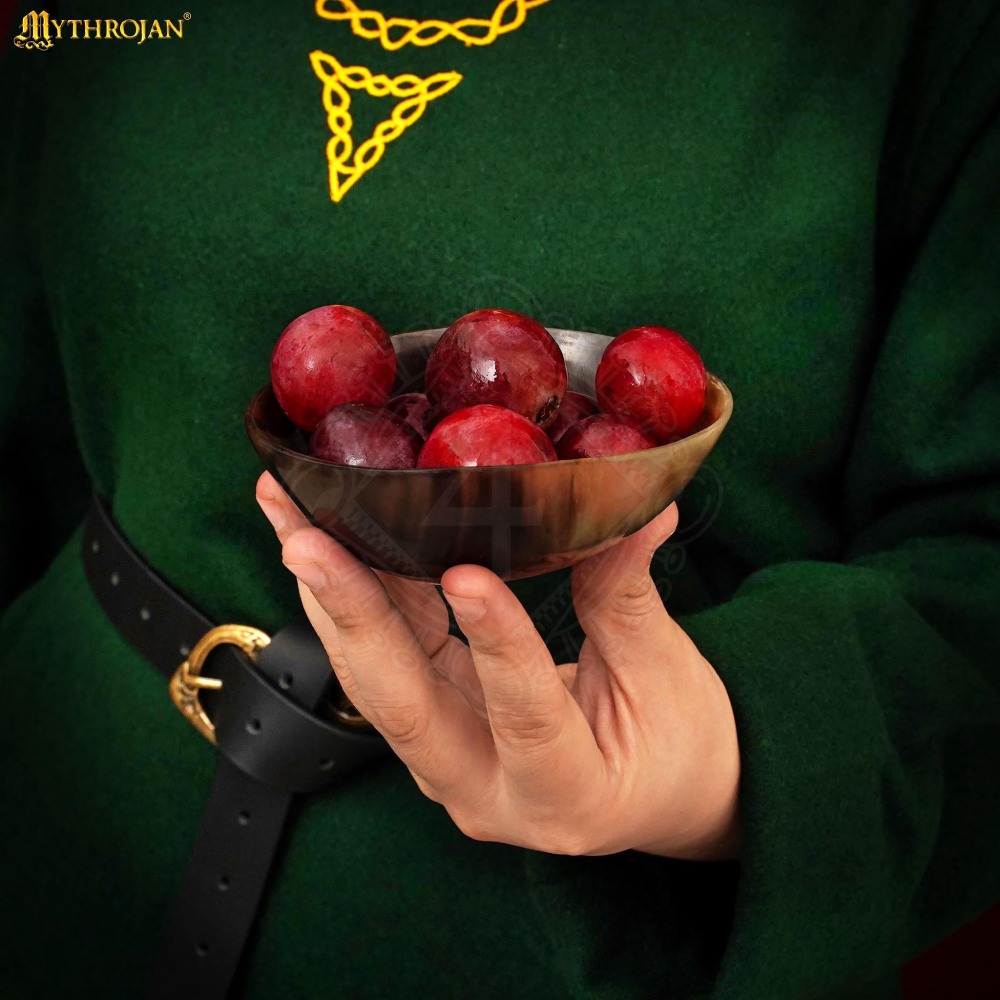 Bringe die Atmosphäre einer Wikinger-Festhalle auf deinen Tisch mit dieser authentischen Schale aus echtem Horn. Jedes Stück wird von Hand aus ethisch gewonnenem Ochsenhorn gefertigt und sorgfältig auf Hochglanz poliert, um seine einzigartige natürliche Maserung hervorzuheben. In der Vergangenheit waren Gefäße aus Horn und Holz aufgrund ihrer Leichtigkeit und Haltbarkeit ein fester Bestandteil des täglichen Lebens. Jetzt kannst du dieses Stück Geschichte auch besitzen. Die Schalen sind in drei praktischen Größen erhältlich, sodass du leicht die richtige für das Servieren von Nüssen, Obst, Dips oder als stilvolle Dekoration auswählen kannst. Jede Wikingerschale ist ein Original, das den Geist vergangener Zeiten in sich trägt. Weitere Produktinformationen ...