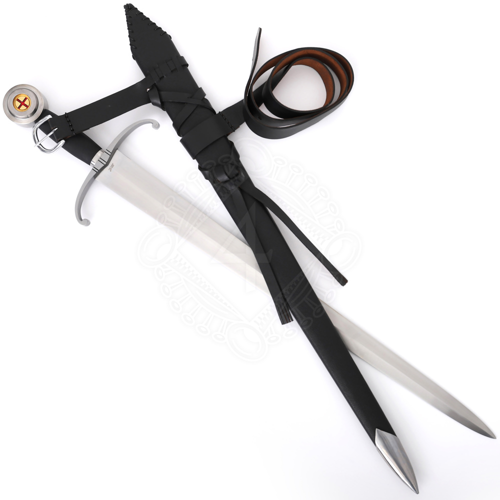 Die Klinge ist aus 1080 Kohlenstoffstahl gefertigt, was eine hervorragende Zähigkeit und Schnitthaltigkeit garantiert. Die Klinge entspricht dem Oakeshott-Typ XVIII und verfügt über einen leichten Hohlschliff, der das Gewicht reduziert, ohne die für Stoßtechniken erforderliche Steifigkeit zu verlieren. Der Knauf ist, exakt wie beim historischen Original, hohl gearbeitet, wodurch das Schwert extrem führig ist und der Schwerpunkt nah an der Parierstange liegt.