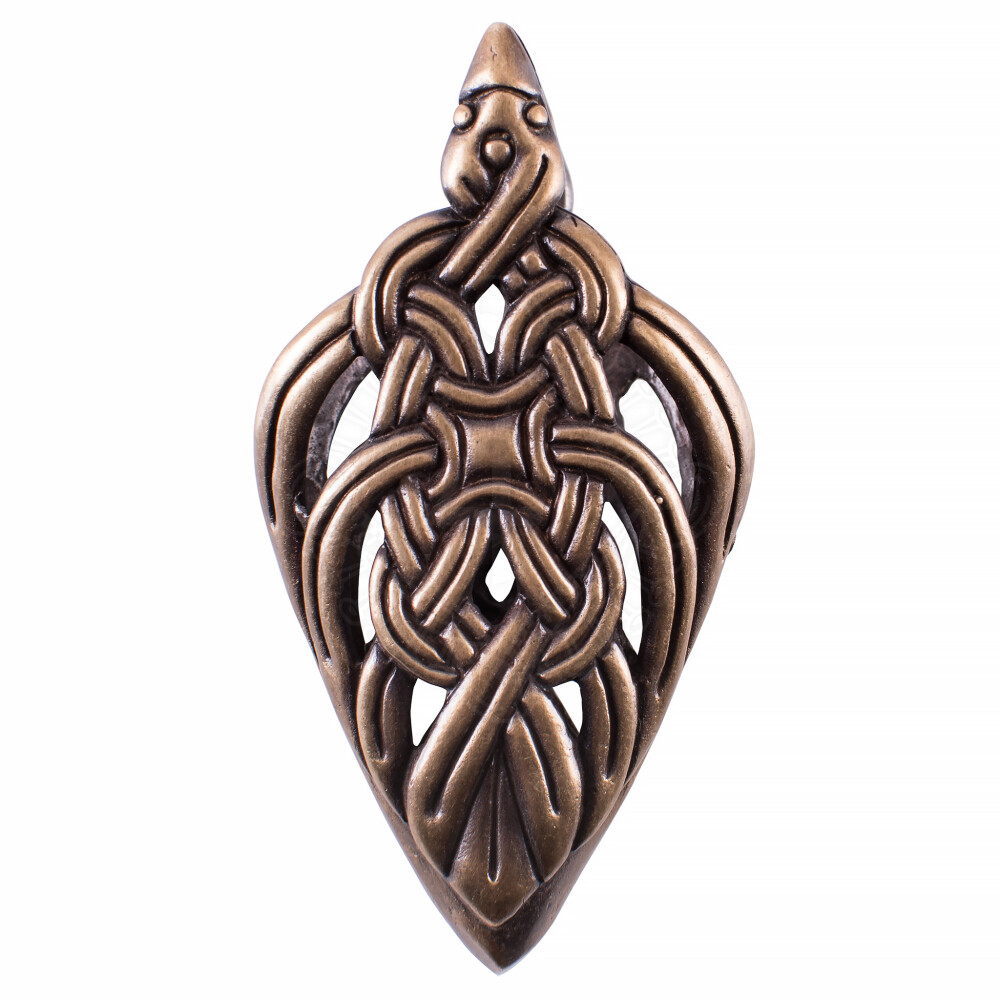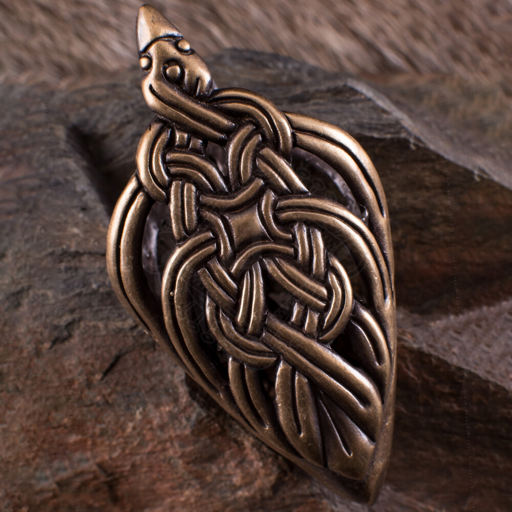 Dieses reich verzierte Scheidenortblech / -ortband ist aus massivem Messing gegossen und mit einem Antik-Finish versehen. Dieser Beschlag ist ein ideales Accessoire zum Bauen eigener Schwertscheiden, eignet sich aber auch hervorragend als Ersatzteil für viele bereits existierende Wikingerschwerter, z.B. die Schwerter aus Haithabu und der Insel Eigg. Die Lieferung erfolgt ohne Befestigungsmaterial.