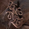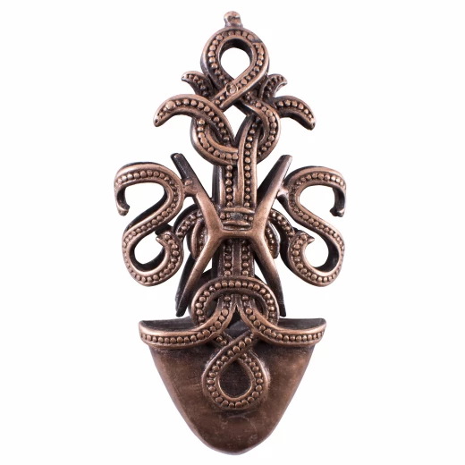 Dieses wunderschöne Scheidenortblech / -ortband aus Bronze ist mit einem Schlangen-Knotenmuster verziert, einem in der keltischen und wikingerzeitlichen Kunst wiederkehrenden Motiv. Dieser Beschlag ist ein ideales Accessoire zum Bauen eigener Schwertscheiden, eignet sich aber auch hervorragend als Ersatzteil für viele bereits existierende Wikingerschwerter. Die Lieferung erfolgt ohne Befestigungsmaterial.