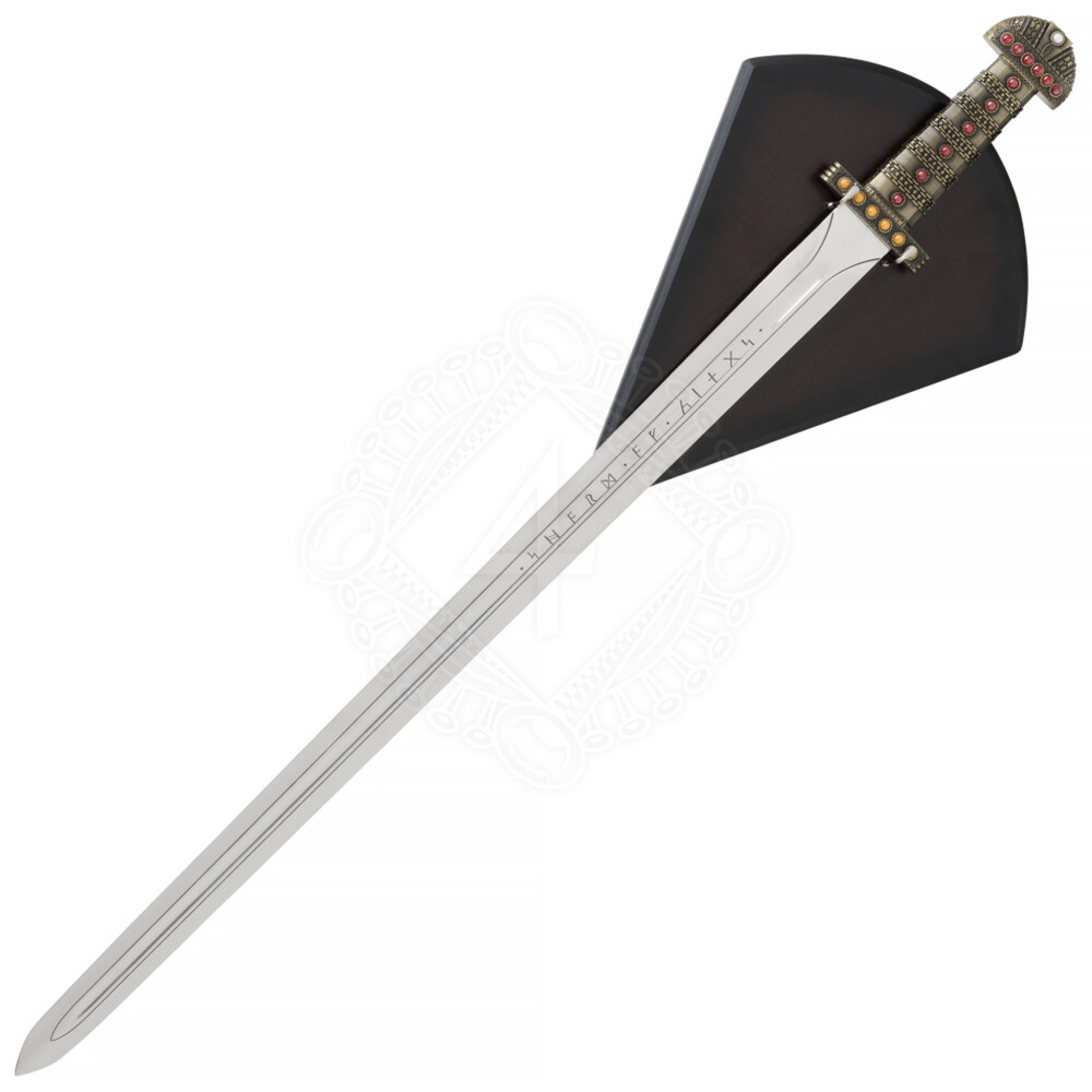 - Dieses reich verzierte Wikingerschwert wird mit einer dekorativen Wandplatte aus Holz ausgeliefert.