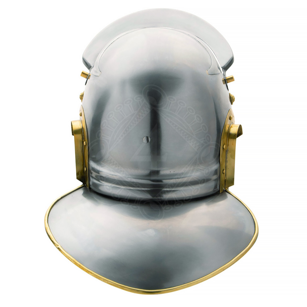 Der tief sitzende Nackenschutz ist typisch für römische Helme und sollte den Träger historisch vor Schlägen in den Nacken schützen. Ein kleiner Augenschirm an der Stirn und die stilisierten „Augenbrauen“-Verstärkungen aus Messing verleihen dem Helm nicht nur Stabilität, sondern auch sein aggressives, militärisches Aussehen. Damit der Helm sicher sitzt, ist er im Inneren mit einem verstellbaren Lederinlet und einem Kinnriemen ausgestattet. So bleibt er auch in der Hitze des Gefechts dort, wo er hingehört.