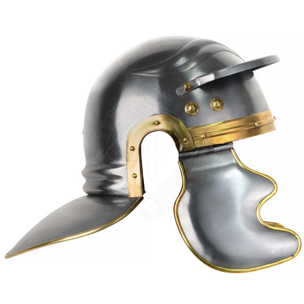 Helme dieser Art, oft als Galea bezeichnet, waren das Markenzeichen der römischen Infanterie im 1. und 2. Jahrhundert n. Chr. Die Römer waren pragmatisch und übernahmen oft die besten Technologien ihrer Gegner – so basierte dieses Design ursprünglich auf keltischen Helmen. Die Verstärkungen und die Form des Nackenschutzes wurden stetig weiterentwickelt, um den Legionär gegen neue Waffenarten der Feinde Roms, wie etwa Krummschwerter, besser zu schützen.