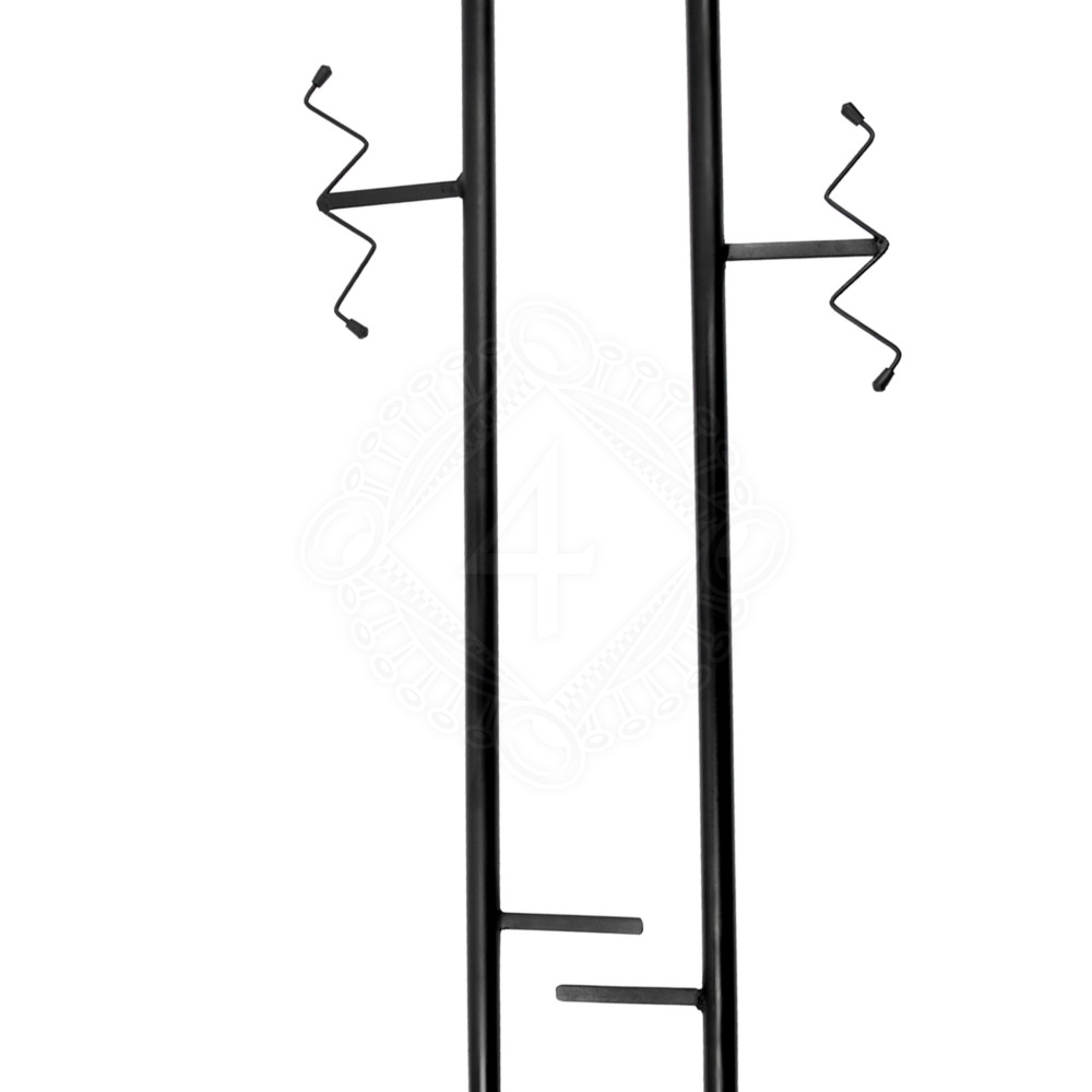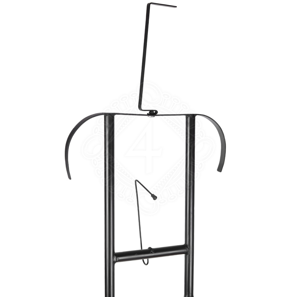 Die Hauptkonstruktion des Ständers besteht aus festen Metallrohren (Stahlrohren), die für erhöhte Korrosionsbeständigkeit und ein elegantes Aussehen schwarz lackiert sind. Die Verbindung der einzelnen Teile ist für eine einfache Montage und Demontage konzipiert, was du beispielsweise beim Transport zu Veranstaltungen schätzen wirst. Der massive Holzsockel garantiert, dass der Ständer fest steht und auch schwerere Rüstungsteile sicher hält.