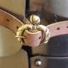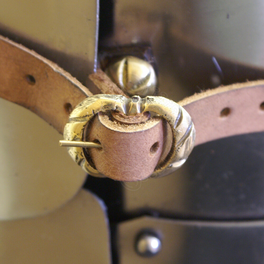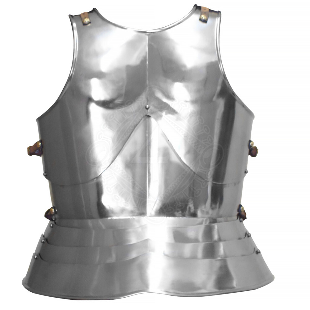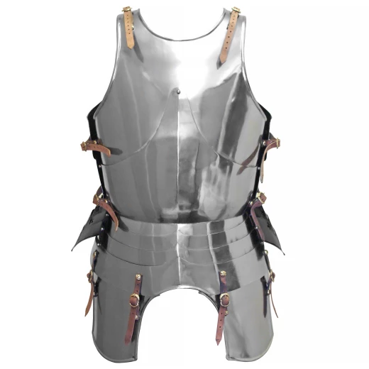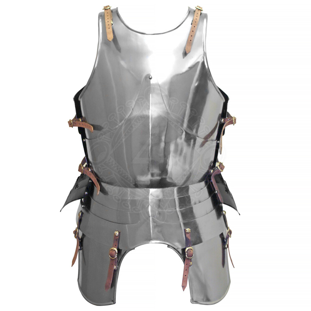 Der Harnisch besteht aus Brust- und Rückenpanzer sowie zwei Beintaschen. Der Brustpanzer wiederum ist aus mehreren Teilen gefertigt: Ober und Unterplatte und insgesamt fünf Bauchreifen. Die Brust-, Rückenpanzer und Beintaschen sind mittels Lederriemen mit authentische Messingschnallen miteinander verbunden und individuell auf die benötigte Größe einstellbar. Die Kanten des Harnisches sind an vielen Stellen kunstvoll umgebördelt. Weitere Produktinformationen ...