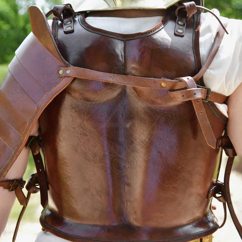 Das Anlegen der Rüstung ist denkbar einfach: Du streifst sie über den Kopf und ziehst die seitlichen Riemen fest. Die Kanten des Leders sind sorgfältig vernäht, was unangenehmes Reiben verhindert und die allgemeine Langlebigkeit erhöht. Für maximalen Tragekomfort empfehle ich dir, unter dem Panzer eine einfache Leinentunika zu tragen, die deinen antiken Look vervollständigt und die Atmungsaktivität verbessert.