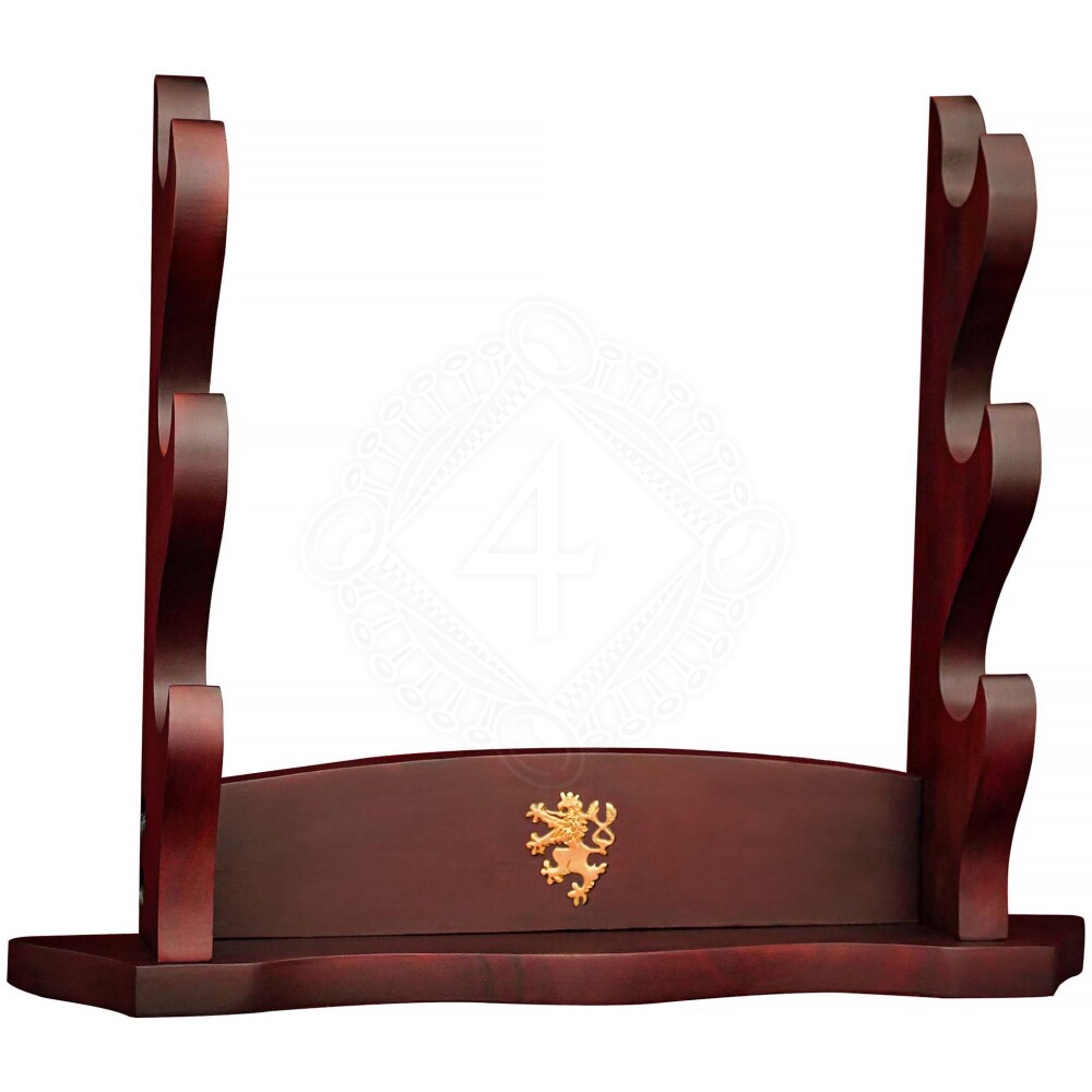 Der Ständer ist aus ausgewähltem Akazien-Hartholz gefertigt, was eine außergewöhnliche Festigkeit, Stabilität und Langlebigkeit garantiert. Die dunkelbraune, mahagoniähnliche Oberfläche verleiht dem Ständer ein luxuriöses und antikes Aussehen. Der Gesamteindruck wird durch ein dezentes goldenes Emblem eines springenden Löwen unterstrichen, das auf der Mittelplatte angebracht ist und Stärke und Mut symbolisiert. Elegant geformte Aussparungen und glatt abgerundete Kanten zeugen von sorgfältiger handwerklicher Verarbeitung.
